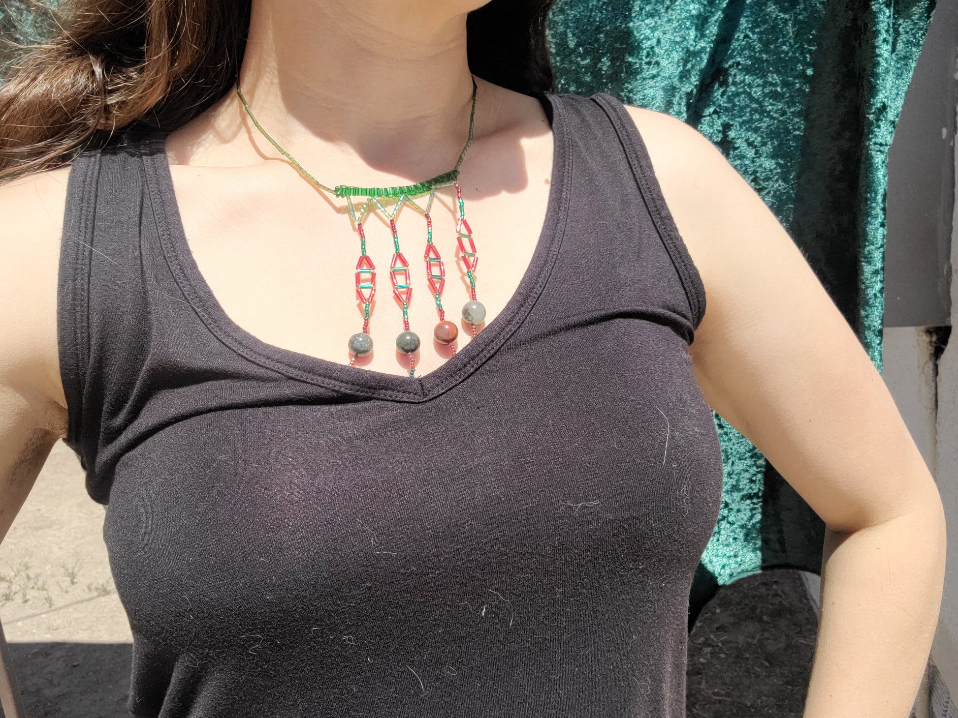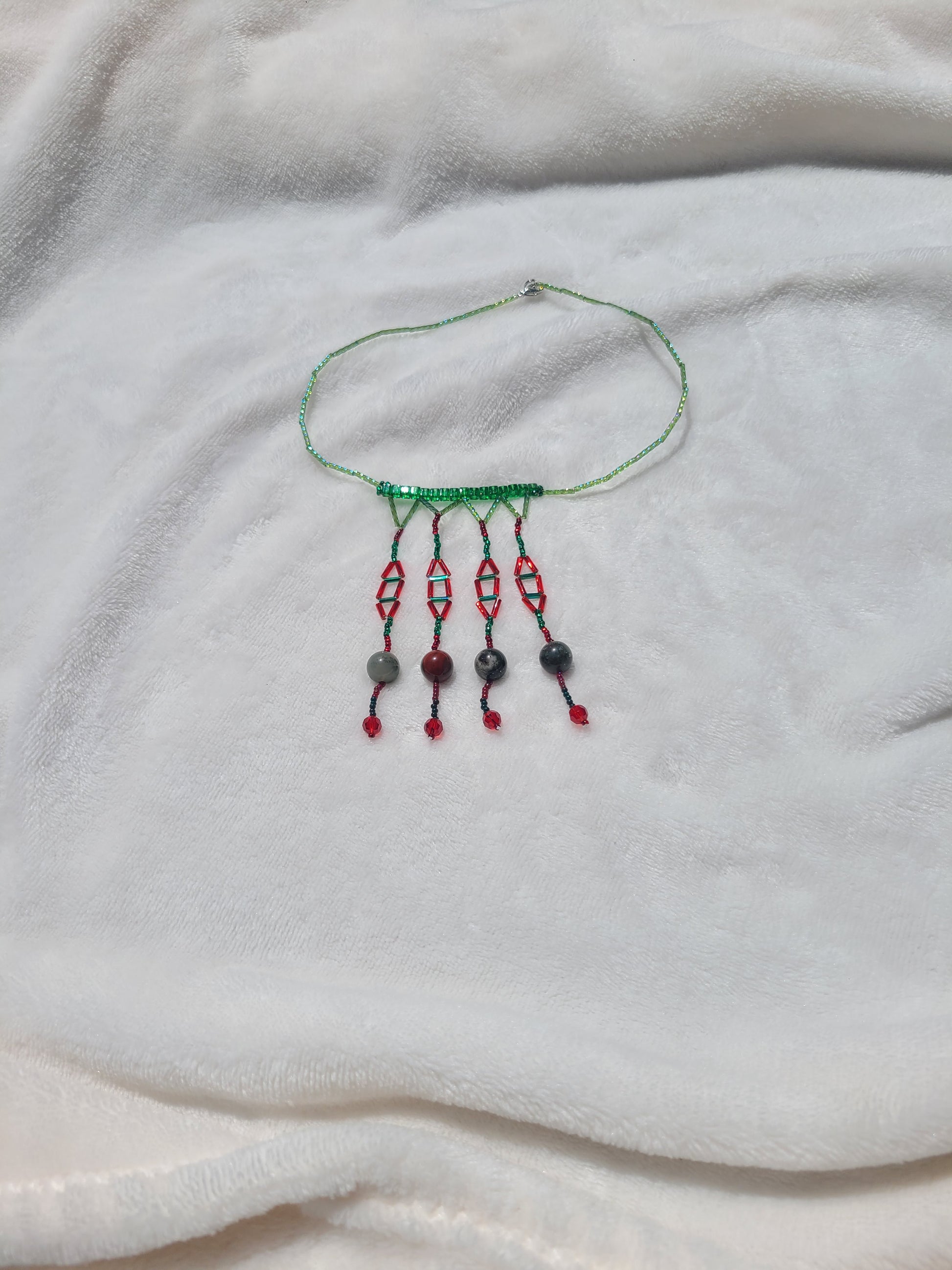 Built around a slim collar of matte green glass beads, this necklace features four vertical strands of red and dark green beads. Each strand ends with a polished African bloodstone bead—smooth and uniquely marbled in earthy tones. The symmetrical, architectural layout creates a crisp silhouette with a modern edge. Pair it with a high-neck black dress, a neutral wrap blouse, or any structured outfit. Ideal for work events or exhibitions where thoughtful design catches an eye.