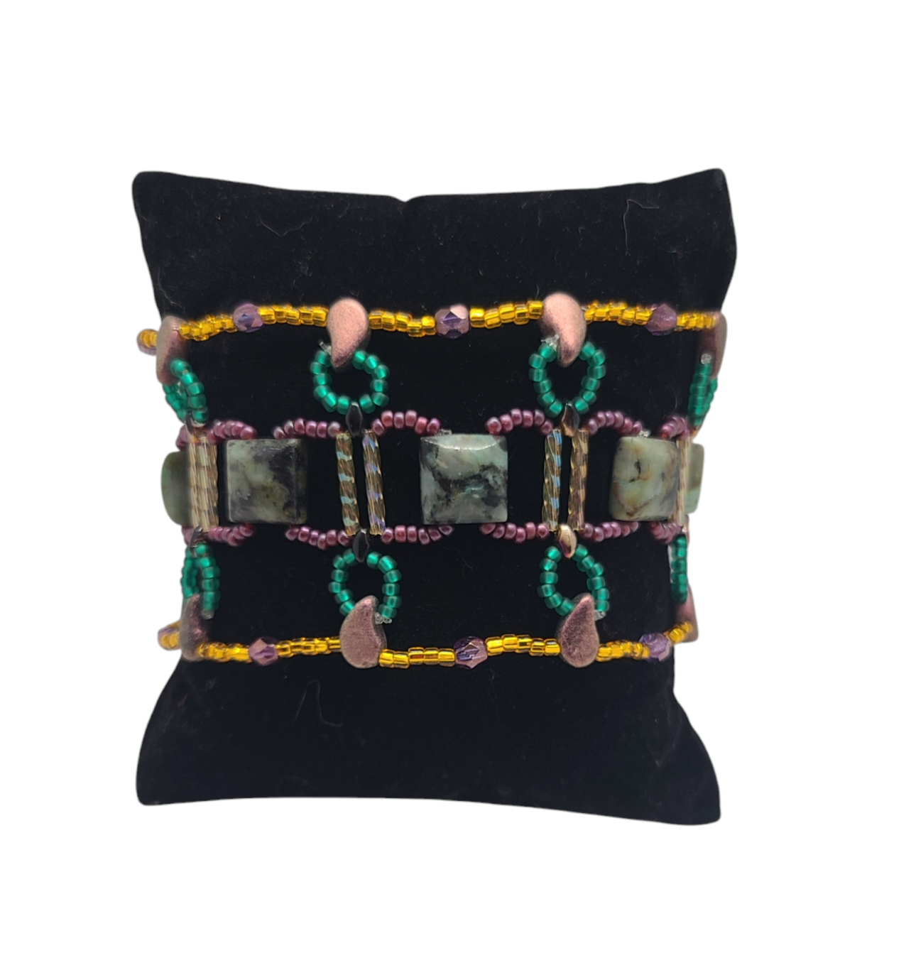 Inspired by architectural grace, this bracelet features rectangular African turquoise stones framed by elegant arches of purple, pink, and teal seed beads. Its geometric design mimics the fluid curves of a suspension bridge, making it both eye-catching and unique. Ideal for creative souls, this piece complements everything from casual jeans and sweaters to flowy tunics. It's a conversation starter that adds an artisan touch to any outfit.