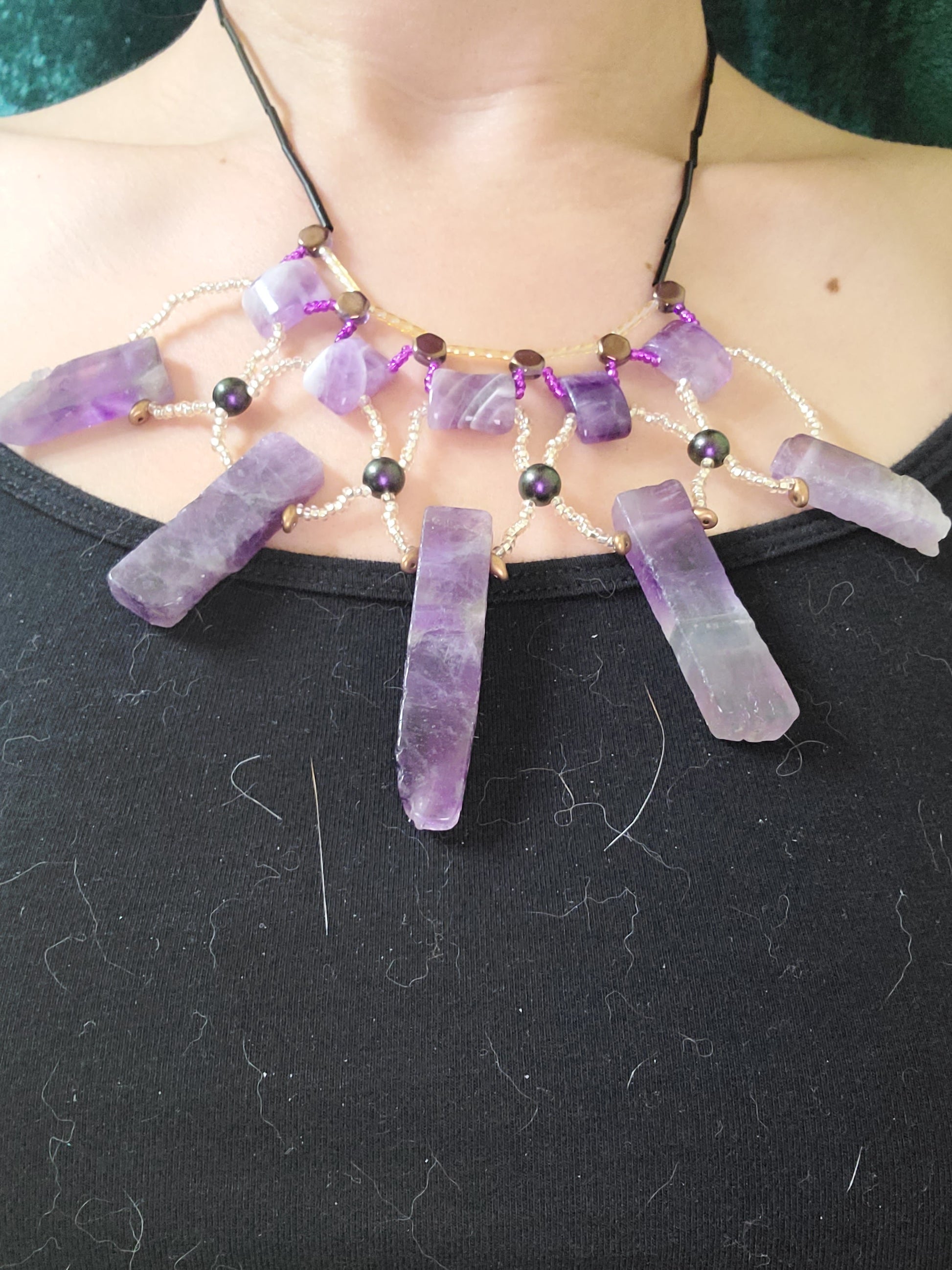 This necklace takes its cues from the Painted Desert, with vibrant amethyst stones framed by beadwork in soft purples and champagne tones. The structured silhouette and layered textures reference shifting rock formations without being literal. Bold but refined, it brings shape and color to the neckline without overwhelming.