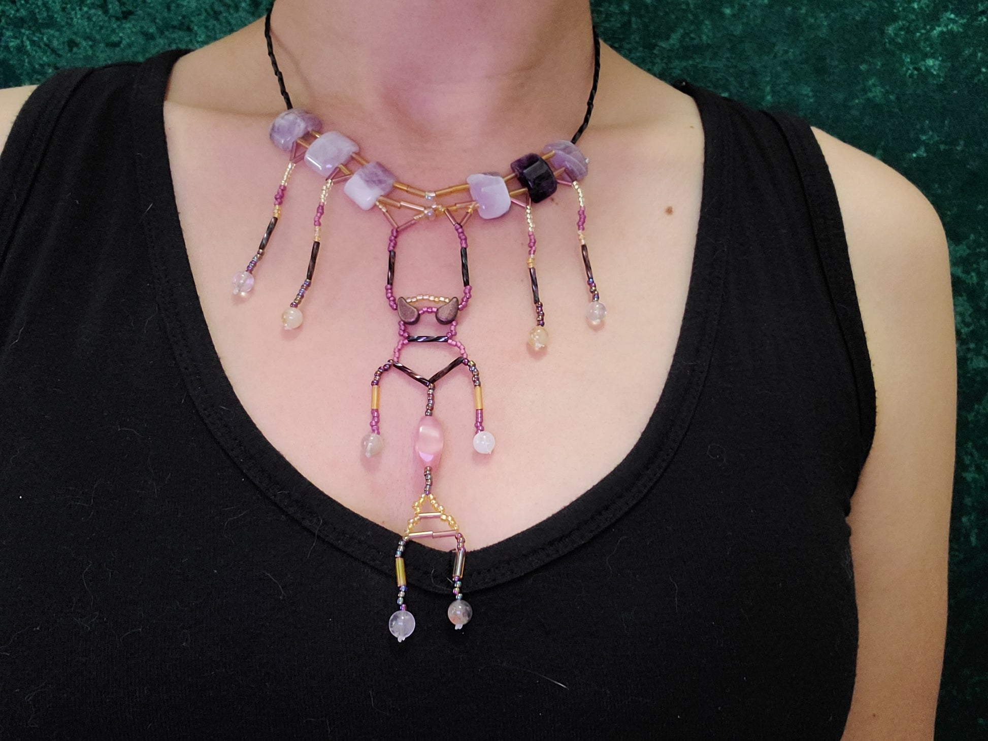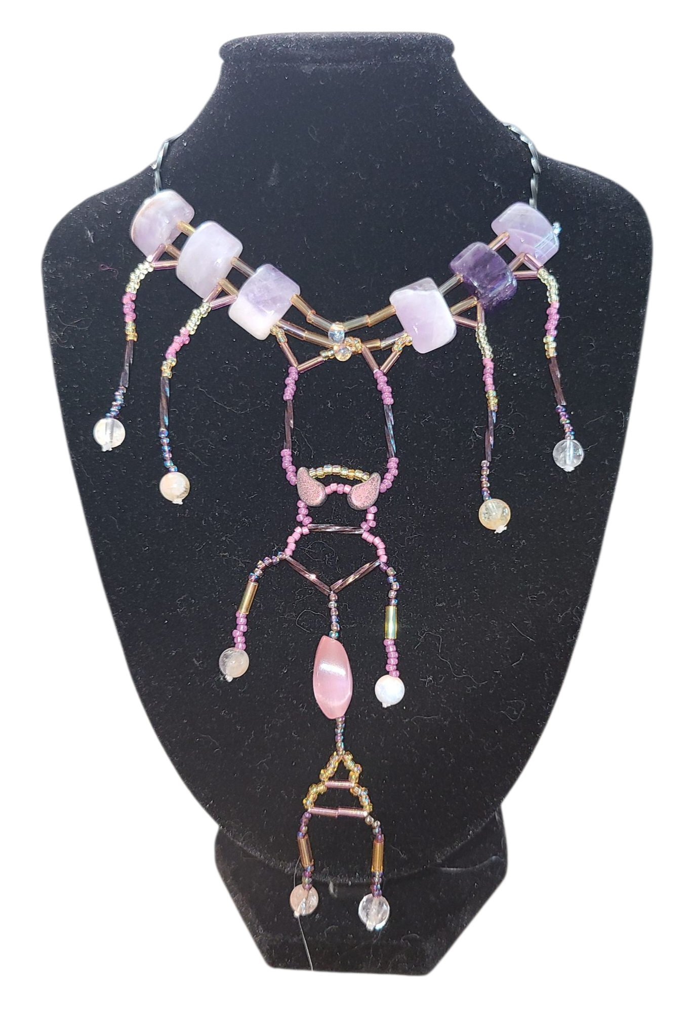 This amethyst statement necklace uses translucent amethyst stones linked with gold and mauve beadwork, ending in small round ametrine stones. The elongated central drop is stacked with beaded shapes and a polished pink glass bead at the center. Inspired by Middle Eastern jewelry, it’s a perfect match for flowing maxi dresses at garden parties.