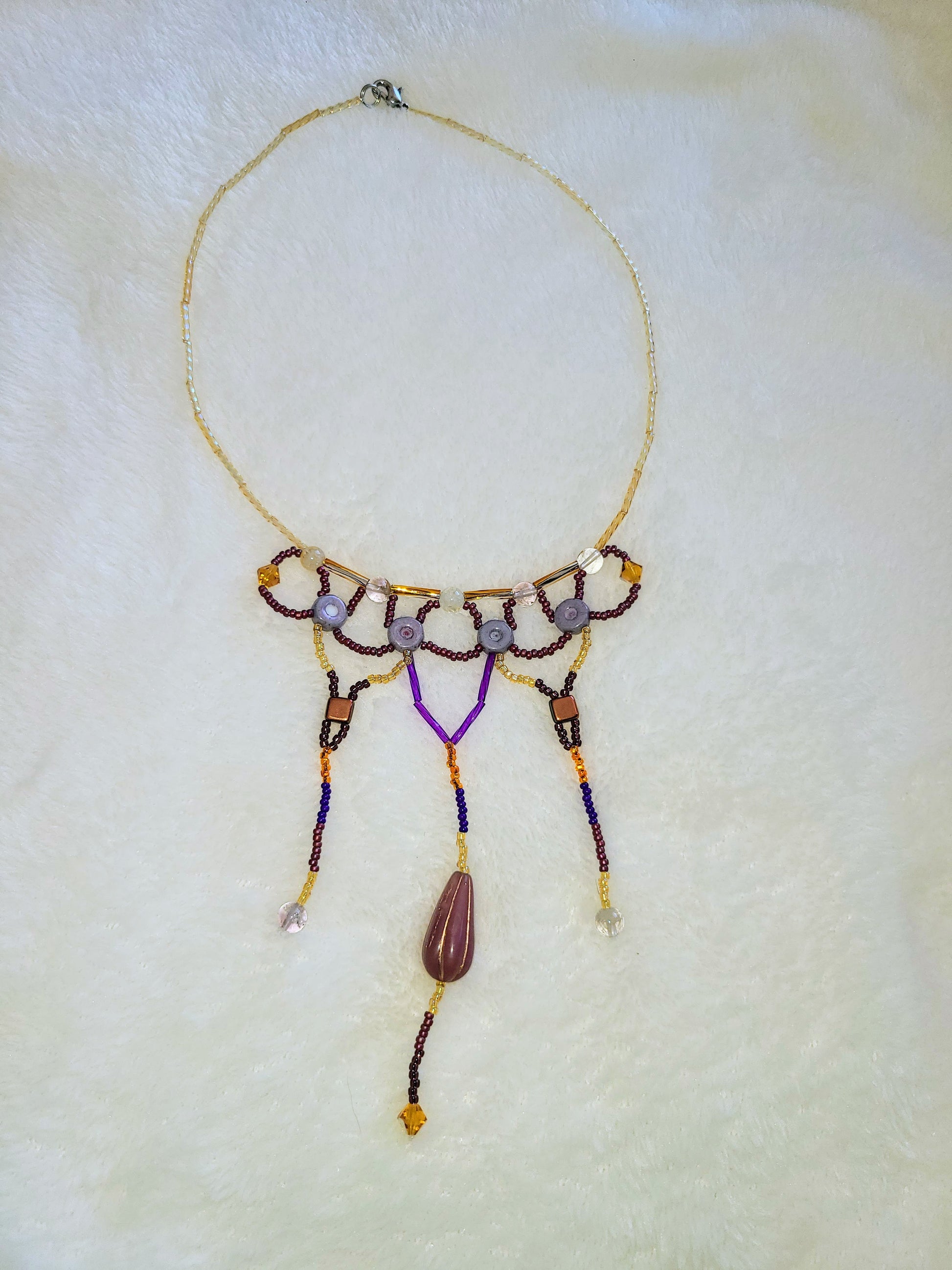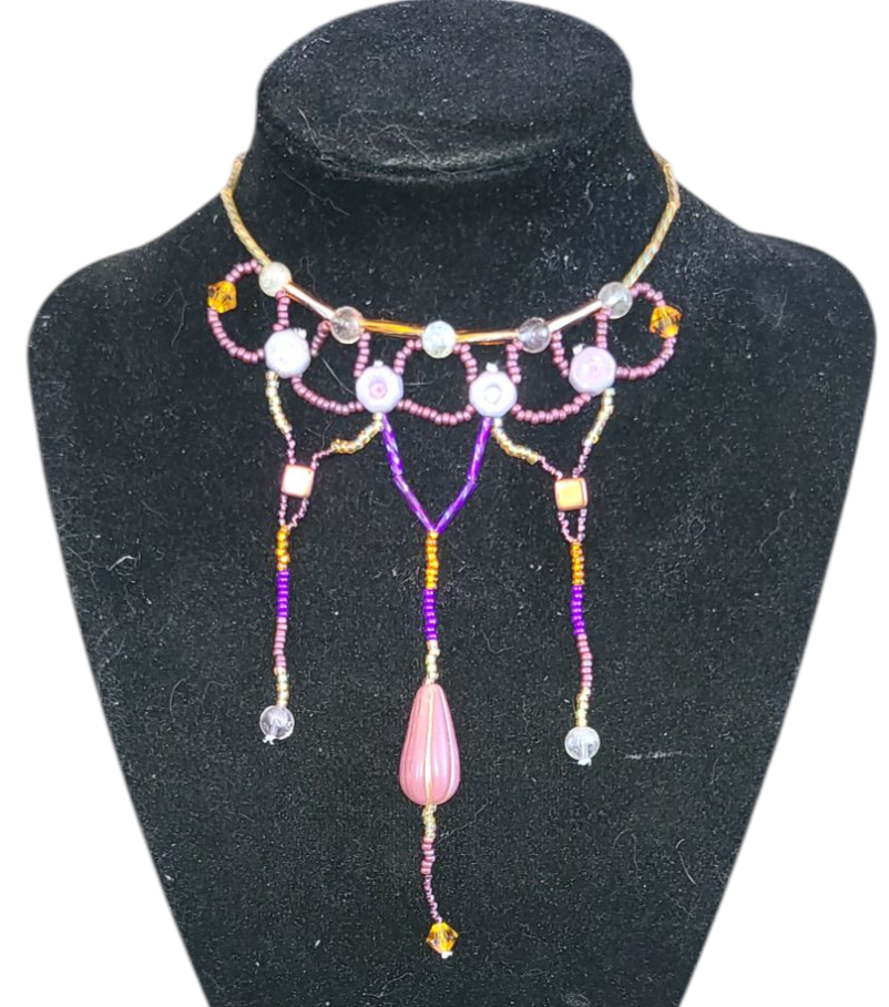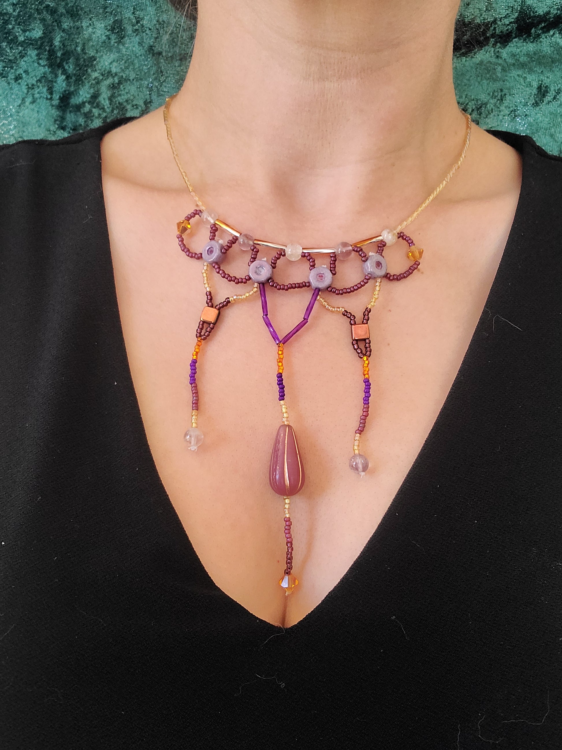 This necklace features intricate looped beadwork with three beaded strands that sit just below the collarbone. Polished ametrine stones are set among deep purple and warm gold beads. A single pink glass drop hangs from the center strand, adding a subtle contrast.