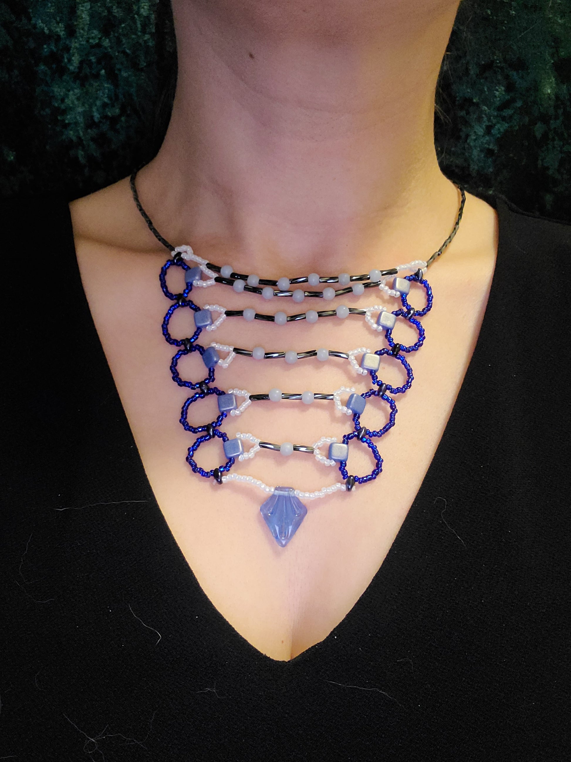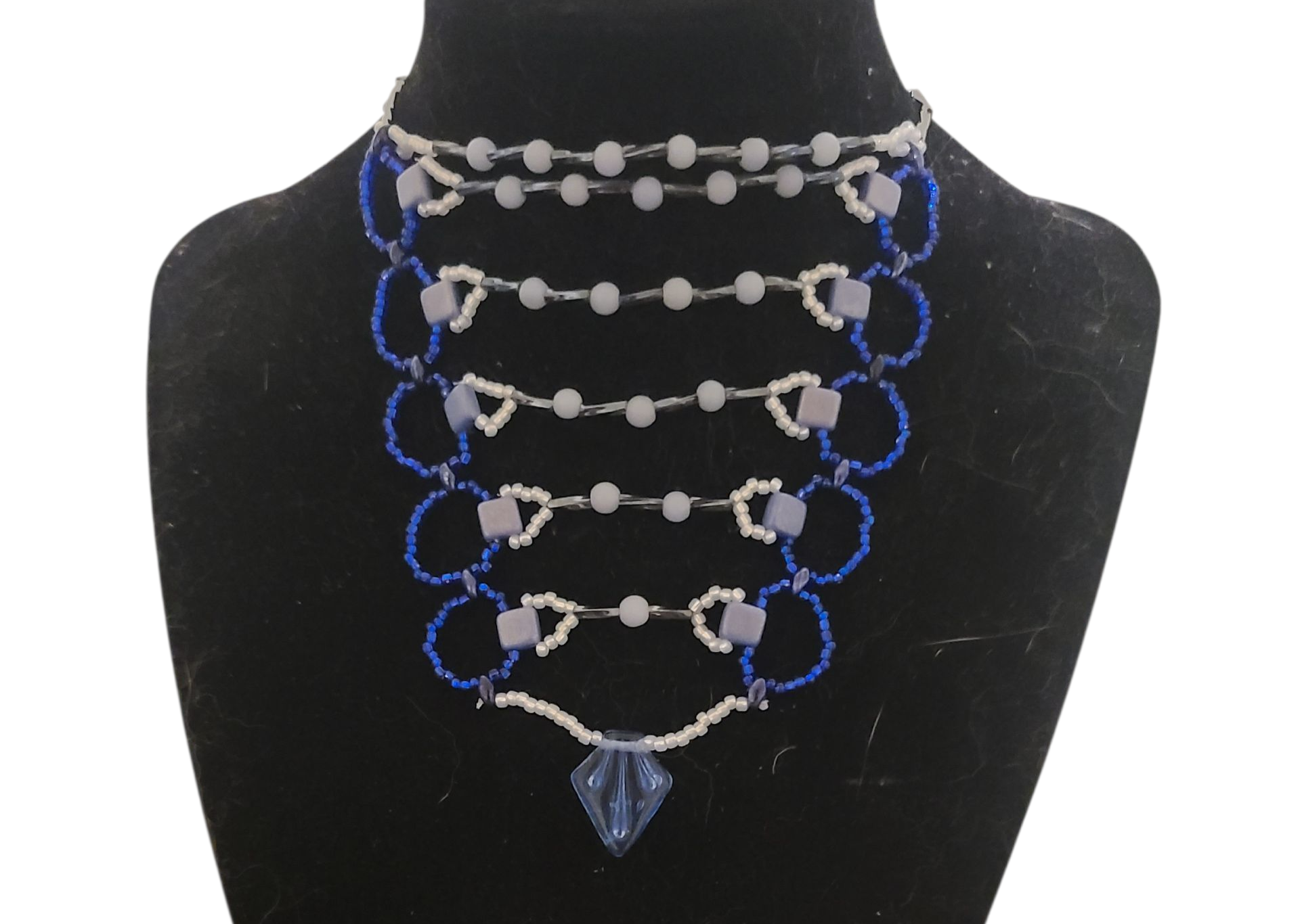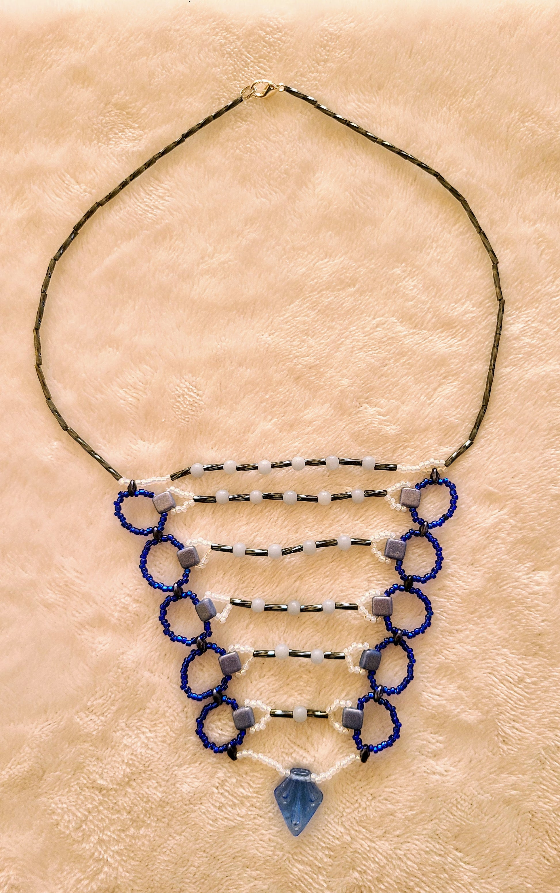 This blue and white beaded triangle statement necklace combines angelite gemstones with glass beads in a structured, tiered design. The necklace cascades in a symmetrical design with tiers like a ladder, ending with a fan-shaped glass drop as a focal point. The cool tones pair beautifully with denim, crisp white tops, or evening wear in deeper shades.