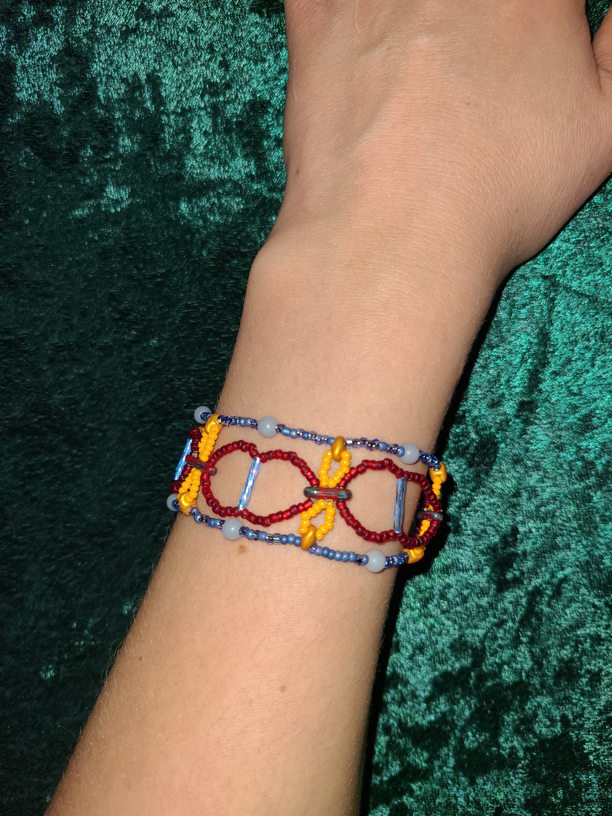 Interlacing bold hues with the soft, misty blue of angelite, this bracelet weaves together symmetry and fluidity in a striking, architectural design. Loops of deep red and golden beads form rhythmic patterns, accented by delicate glass details that enhance its intricate structure. The openwork style creates a balance of lightness and presence, making it a standout piece.