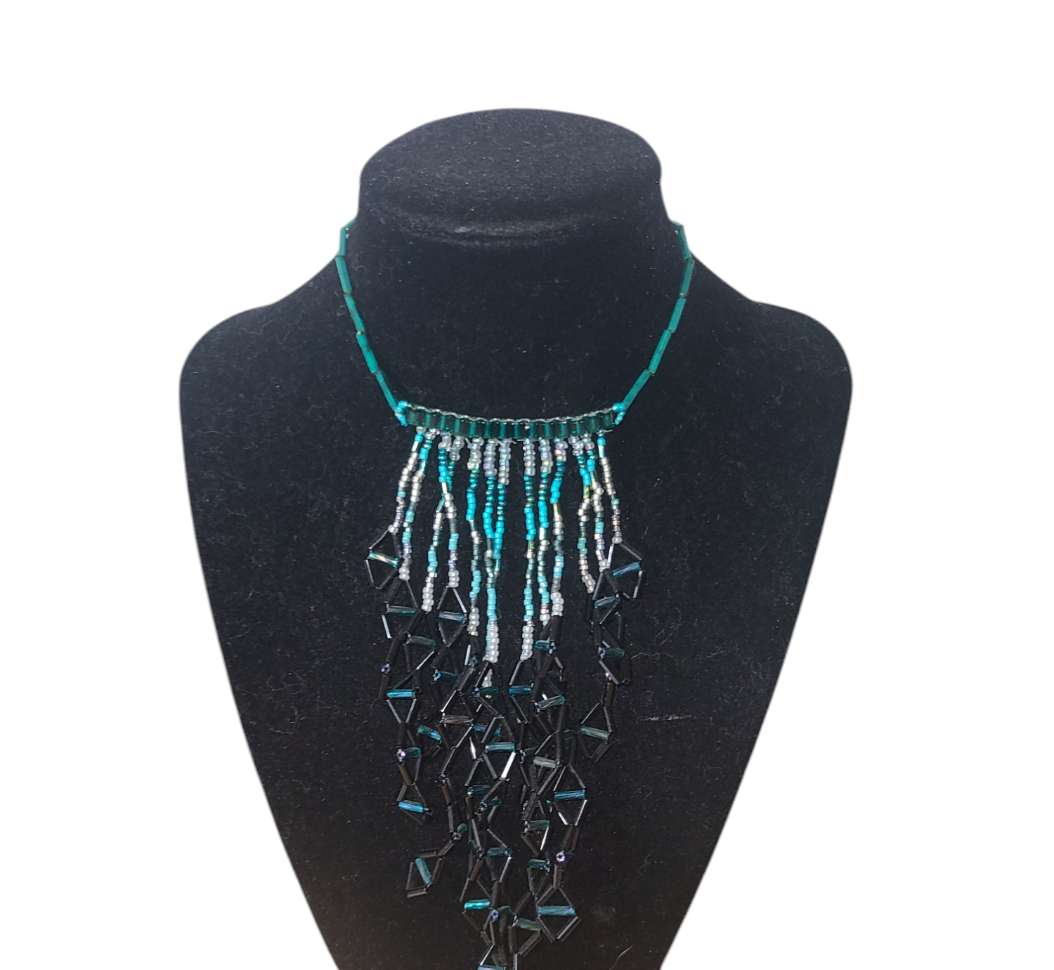 This captivating necklace features a cascading waterfall of hand-beaded triangles in black and teal. The fringe is adorned with triangle-shaped details, and the color gradient transitions from teal and mint green at the top to black and teal triangles. The lightweight design makes it a versatile accessory, perfect for both casual and dressy occasions.