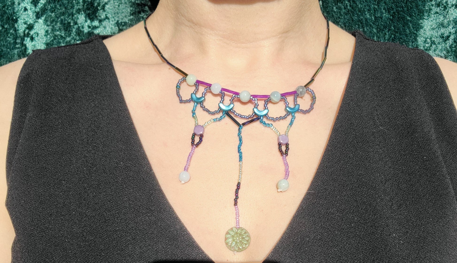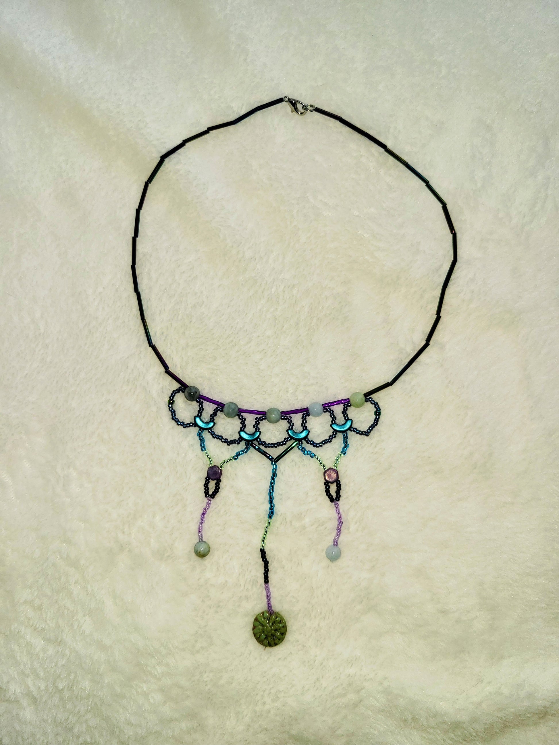 Looped beadwork forms the upper row of this necklace, supporting three straight strands that fall just below the collarbone. Soft teal aquamarine beads accent the loops and strands, each ending with a smooth round stone. A circular floral bead sits at the center of the middle strand, serving as the necklace’s focal point.