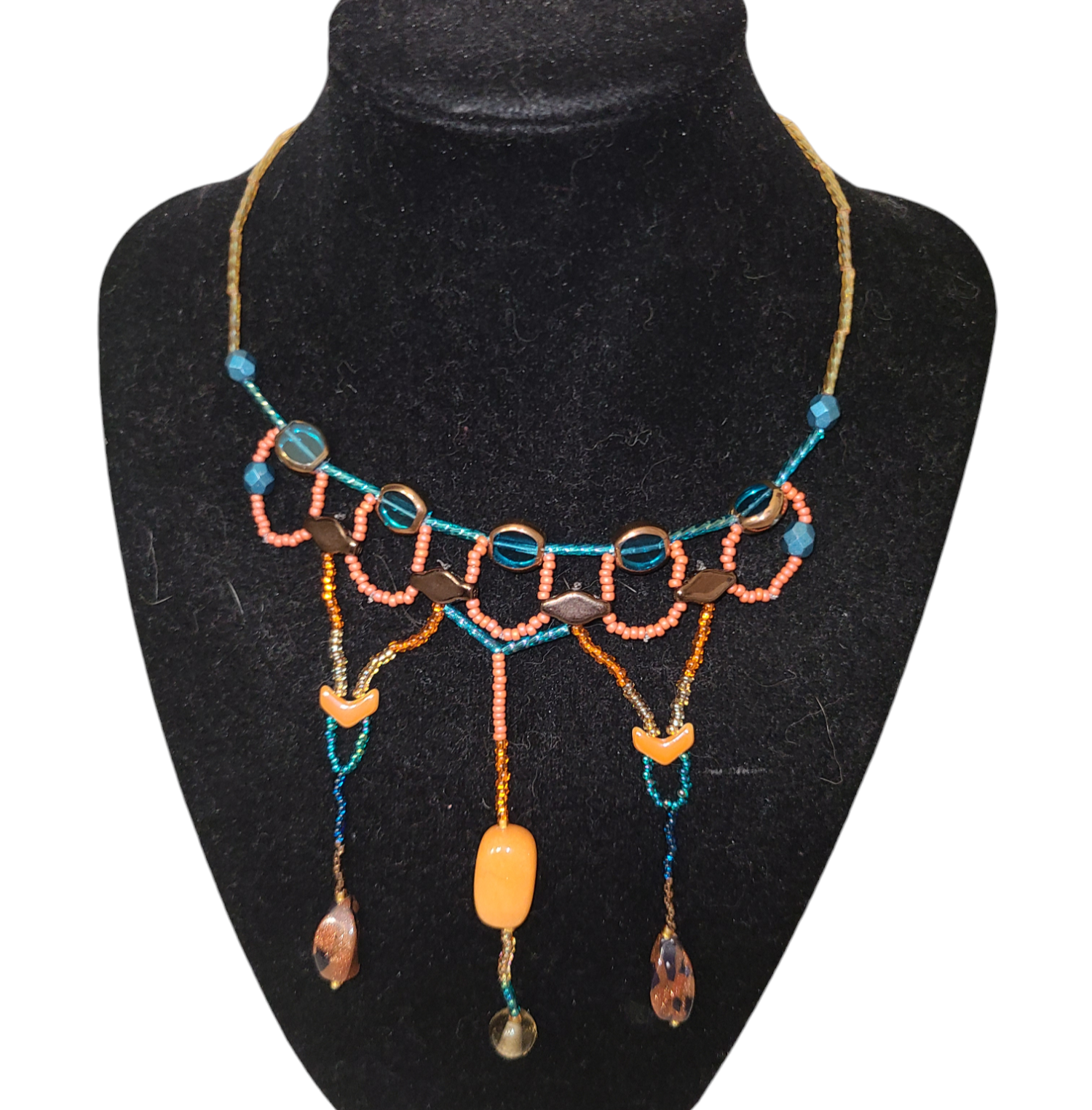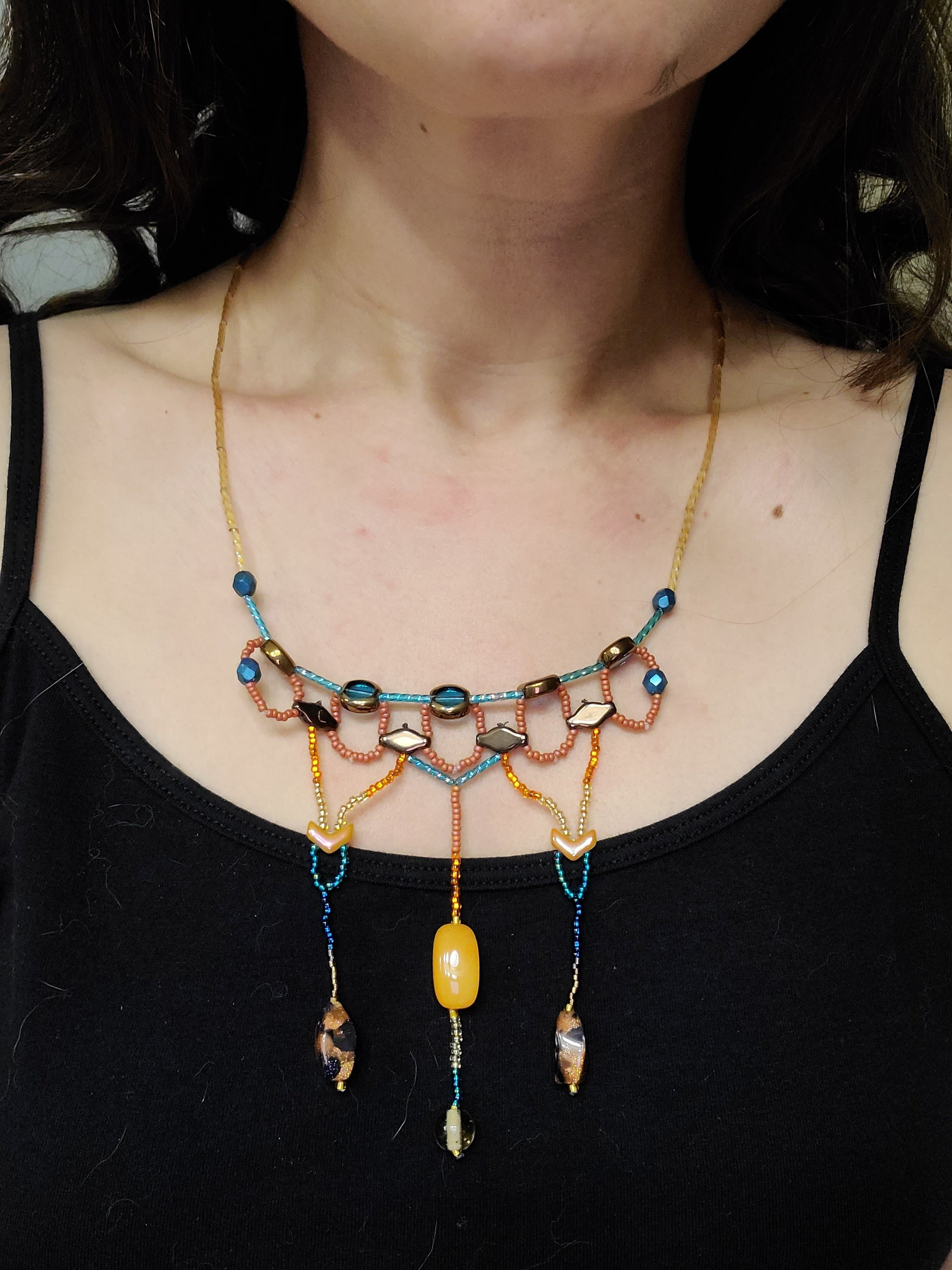 This necklace features interlocking circles forming the upper row, with three cascading dangles at the center. The color story plays with burnt orange and teal beads, punctuated by subtle gold accents that bring a quiet richness to the design. Lightweight and comfortable, it moves easily through your day without weighing you down.