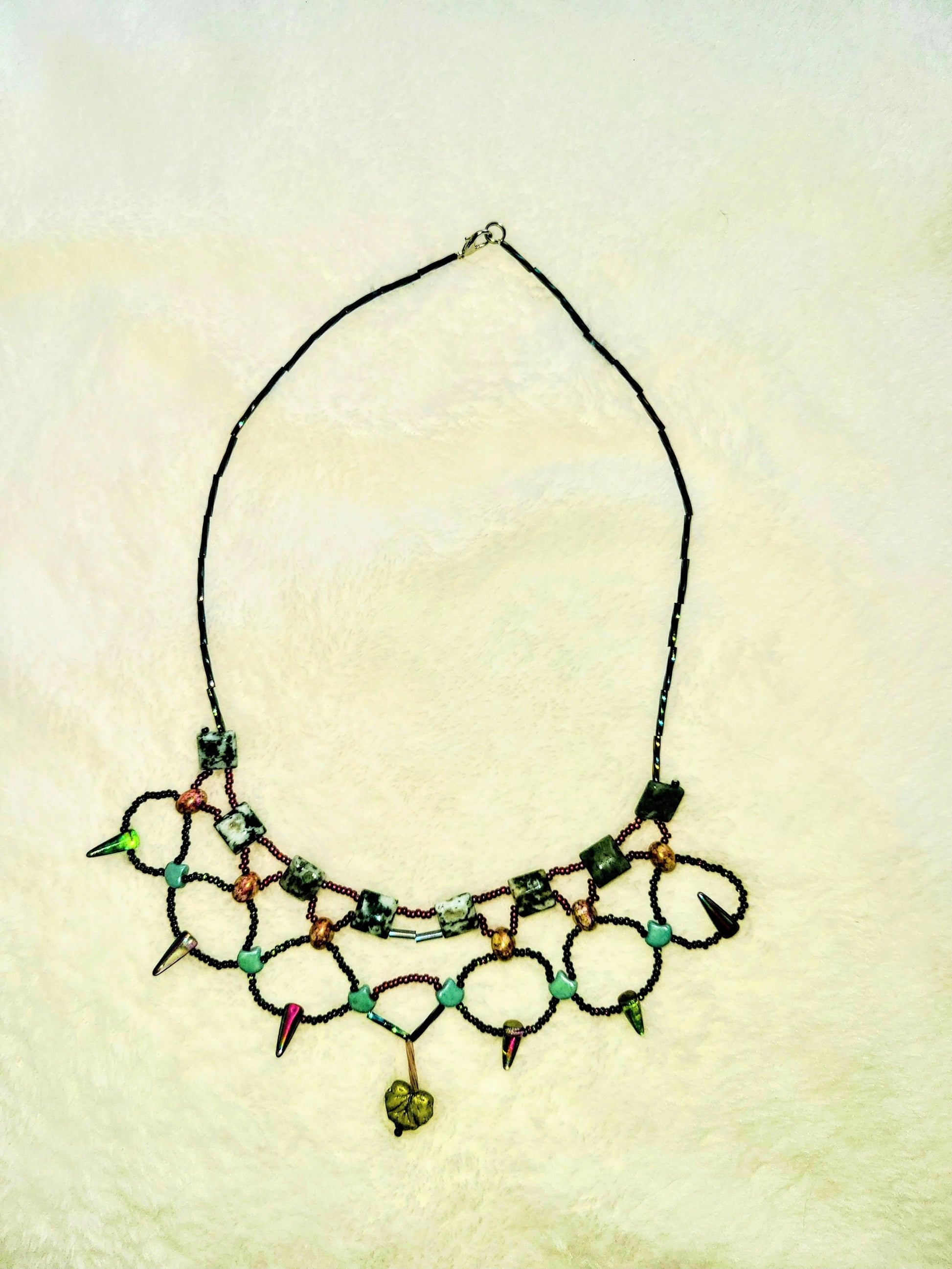 Green tree agate stones alternate with soft earth-toned beads in the upper row, with looping beaded strands creating a lattice effect. Small, pointed drops in muted greens evoke the texture of autumn foliage, while a central gold-toned charm adds warmth. Pair it with a cozy knit sweater and ankle boots for a perfect autumn look, ideal for farmers' markets, nature walks, or weekend coffee dates.