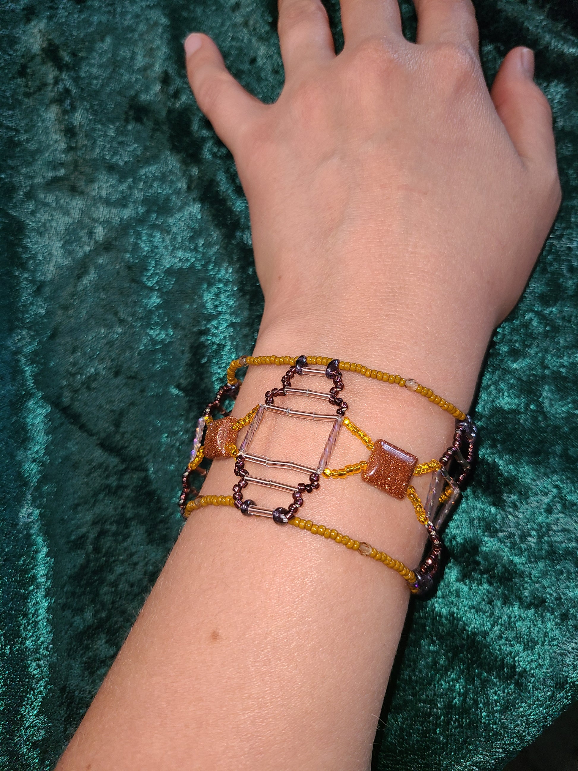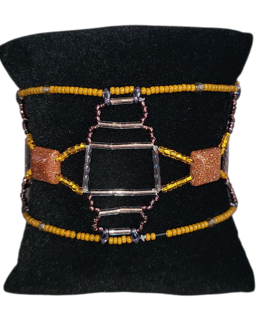 Elongated hexagon beadwork links each hold a deep golden-brown goldstone gemstone, accented by amber-hued beads along the sides. This boho chic bracelet works beautifully with autumn-toned tops and dresses.