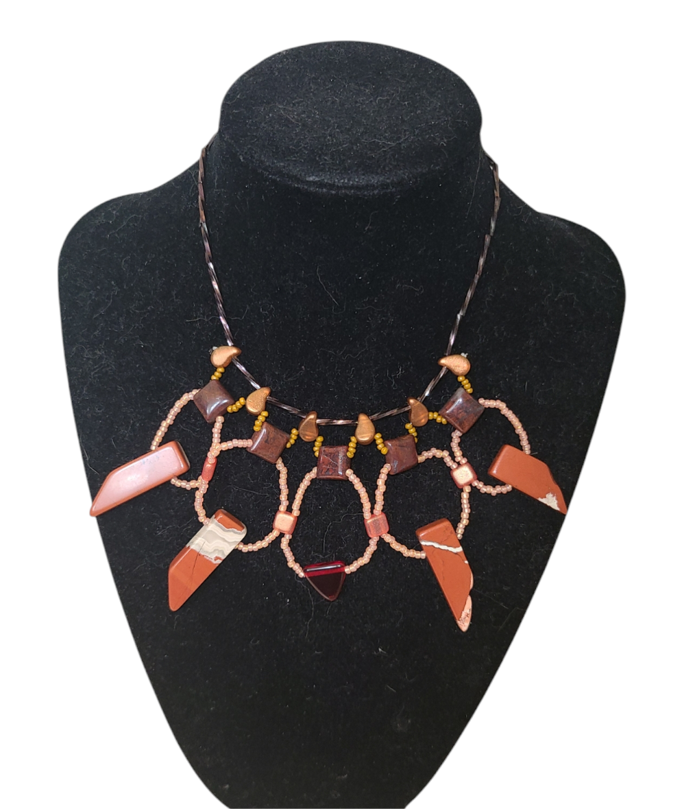 This bold necklace features deep red jasper beads arranged in an asymmetric pattern, anchored by a luminous glass centerpiece. Irregular jasper fragments in warm, earthy reds and rust tones give the piece its sculptural flow, with a silhouette that moves fluidly across the neckline. The mix of texture, form, and saturation makes it feel grounded but unexpected.