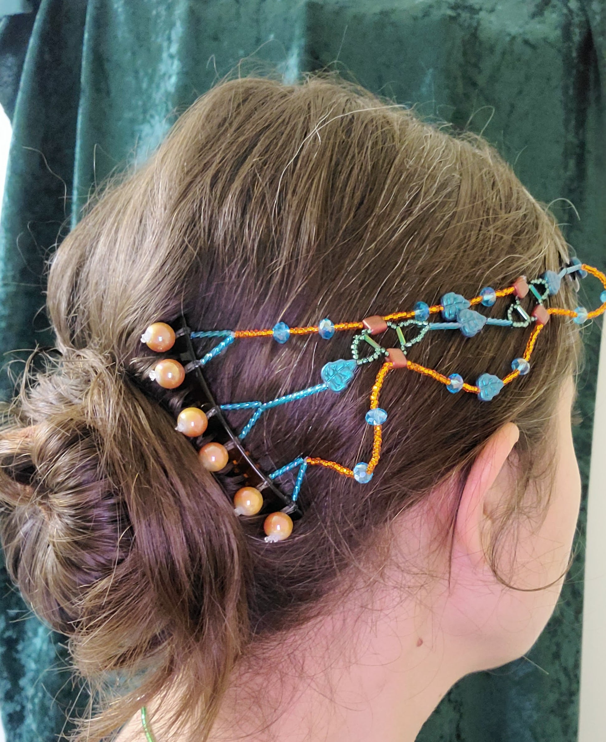 This hair accessory features a comb with orange glass beads. Detailed orange and teal beadwork, accented with glass leaf beads, run along the side of the head, secured with a no-slip barrette at the afront.