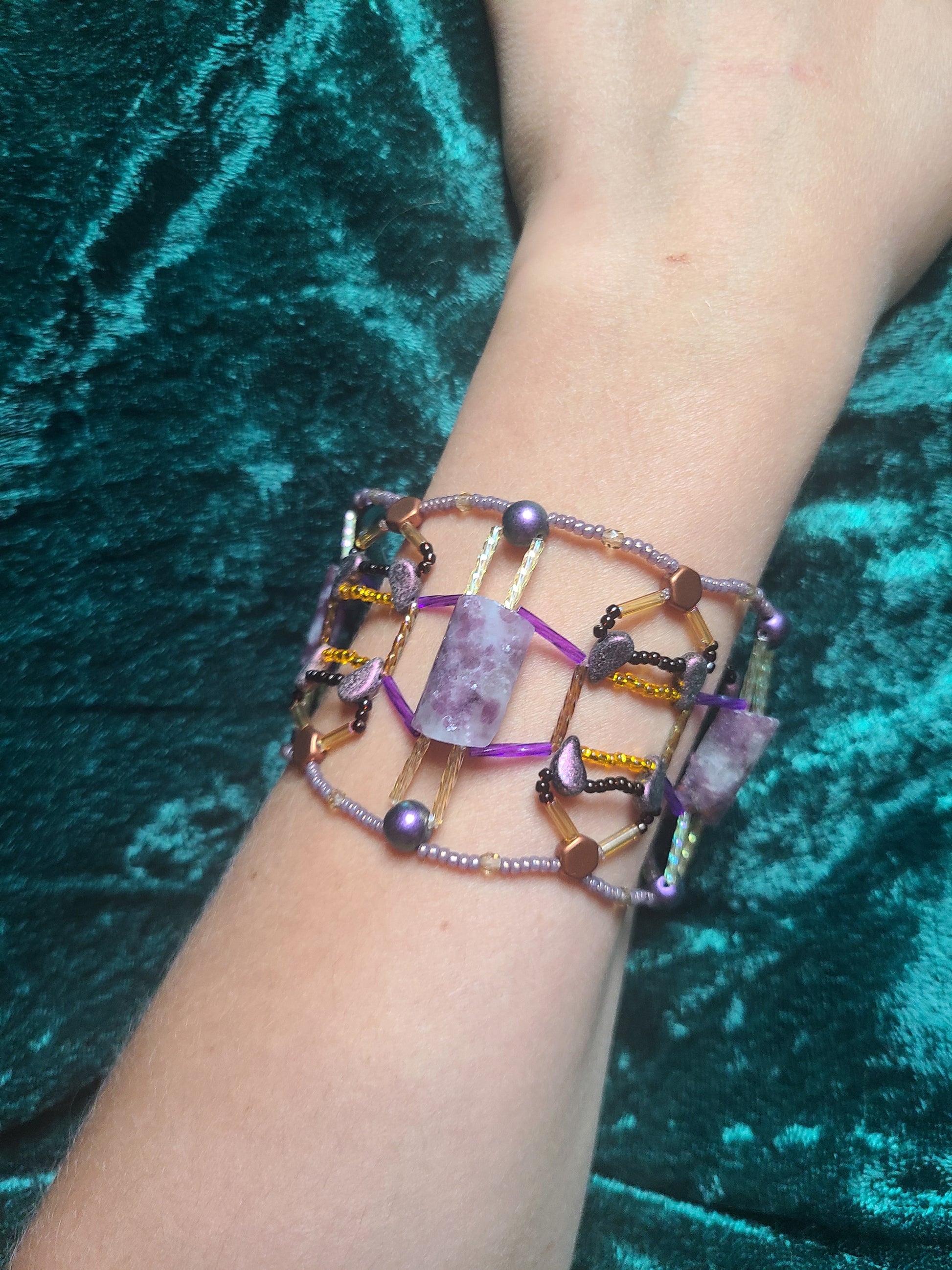 This lepidolite bracelet is a blend of warmth and sophistication. Its focal lepidolite stones feature soft purple hues, framed by bronze, gold, and copper beadwork that mimics the changing colors of fall. Delicate purple accents and bold geometric patterns make this bracelet a show-stopping piece that pairs effortlessly with jewel-toned dresses, tailored blazers, or cozy scarves. Ideal for seasonal gatherings, evenings by the fire, or festive celebrations, this bracelet adds a touch of refined artistry to any ensemble.
