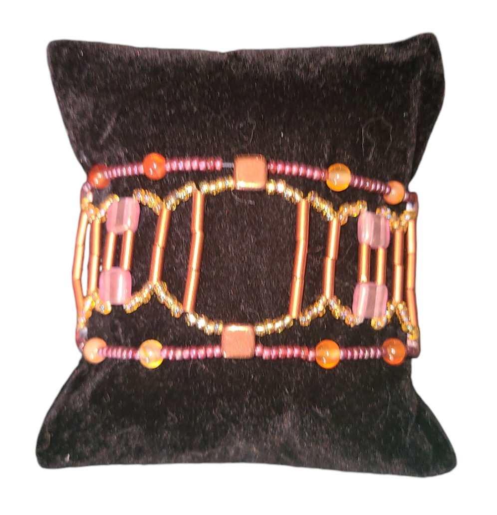 Radiating the fiery hues of a setting sun, the Autumn Sunset Carnelian Skeletal Spiral Bracelet draws inspiration from the elegance of Phoenician jewelry. Vibrant carnelian stones frame warm copper and golden beadwork, creating a fluid spiral helix design that feels both ancient and modern. Pair this bold piece with a rust-colored dress, metallic accessories, or a sleek jumpsuit for formal events, weddings, or an elegant dinner party. This bracelet brings a vibrant yet timeless energy to any outfit.
