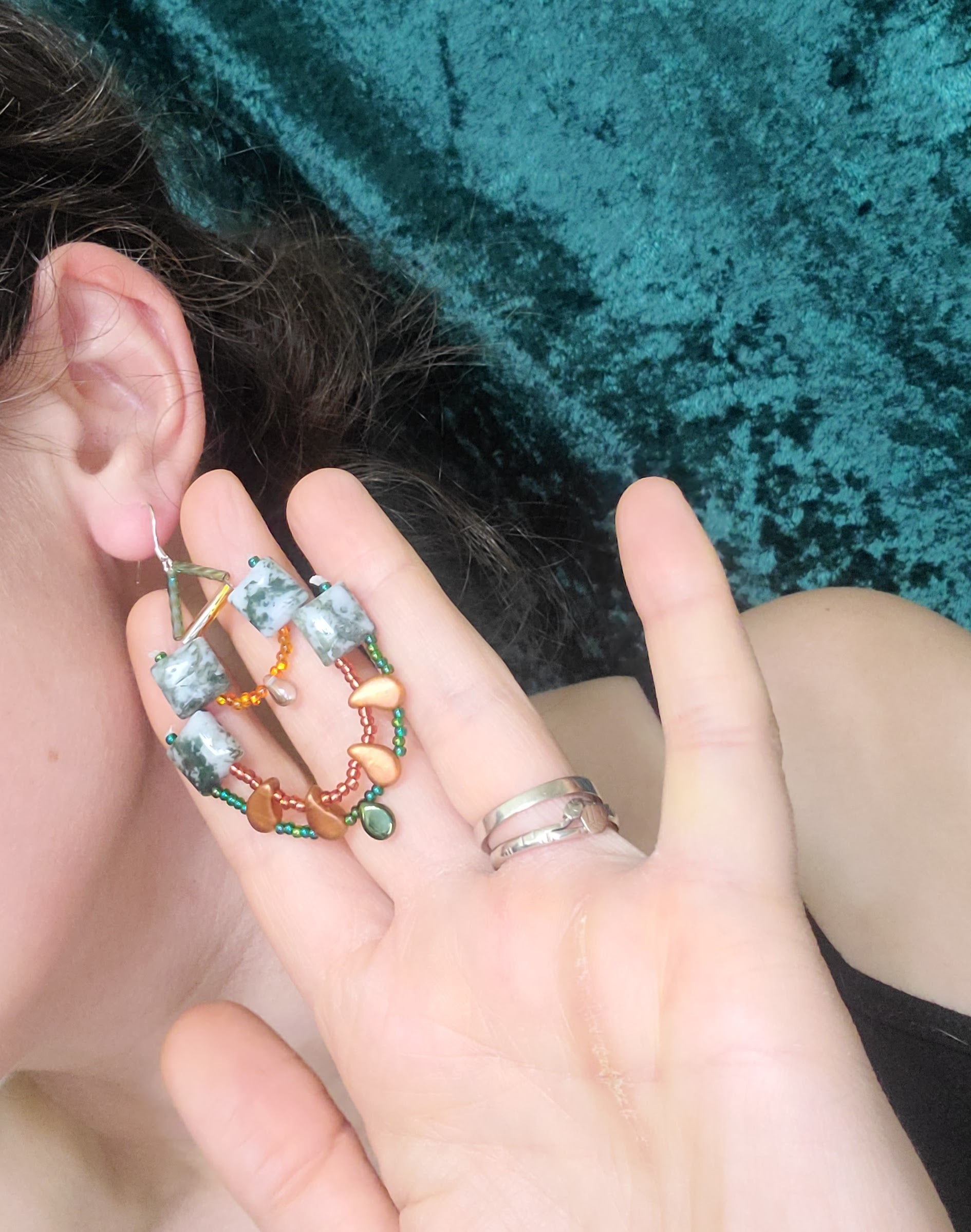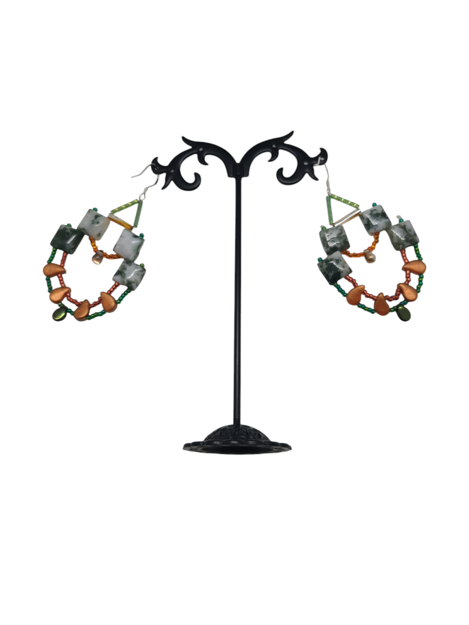Step into fall with the Autumn Tree Agate Downtown Dazzle earrings. These eye-catching teardrop earrings combine warm autumn orange beadwork with polished green and gray tree agate gemstones, forming a striking geometric pattern. The angular details and earthy palette evoke the transition of autumn leaves, offering a bold, nature-inspired accessory for Bohemian and artistic styles. Perfect for adding a pop of seasonal charm to your outfit.