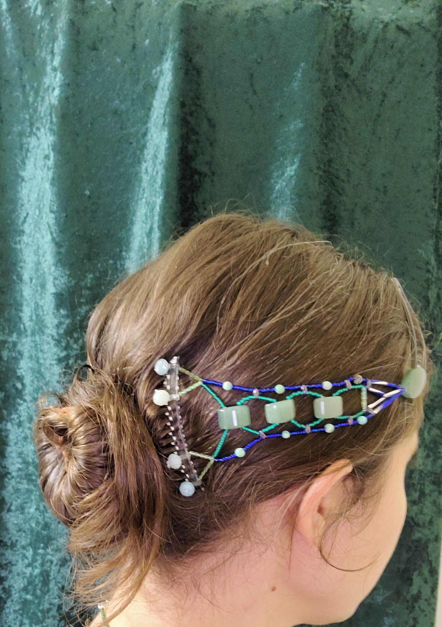 This hair jewelry is adorned with mint green glass beads on a comb and features stunning aventurine stones surrounded by cobalt and green beadwork along the side of the head. The no-slip barrette ensures a secure and comfortable fit. Elevate your hair game with this unique accessory.