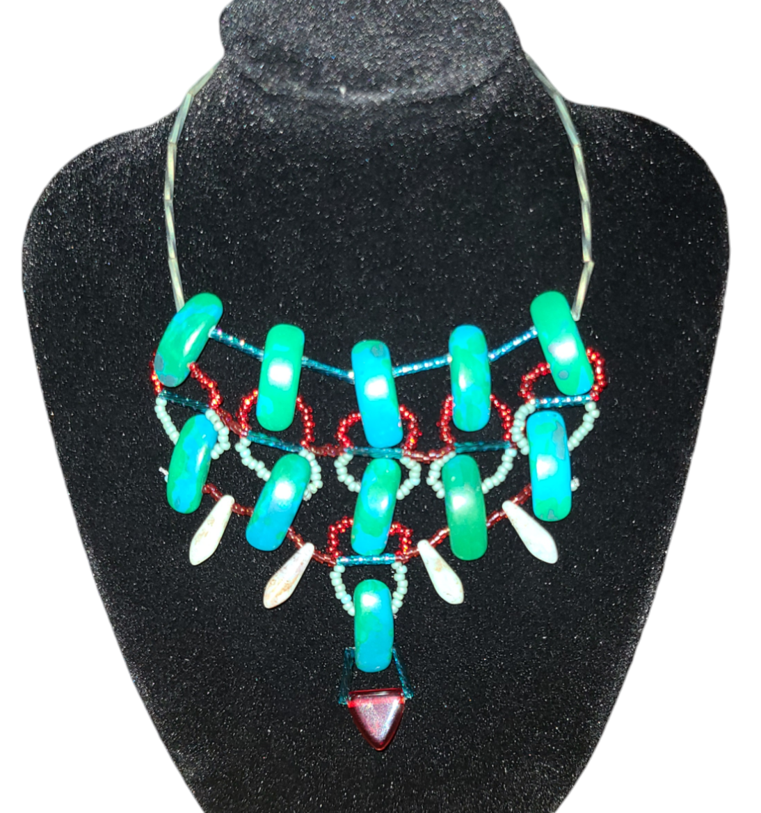 This necklace is inspired by intricate silver necklaces from Morocco, with blue and green azurite beads surrounded by rich red beadwork. Mint green glass beads trace the base, while a single red glass bead anchors the center strand.