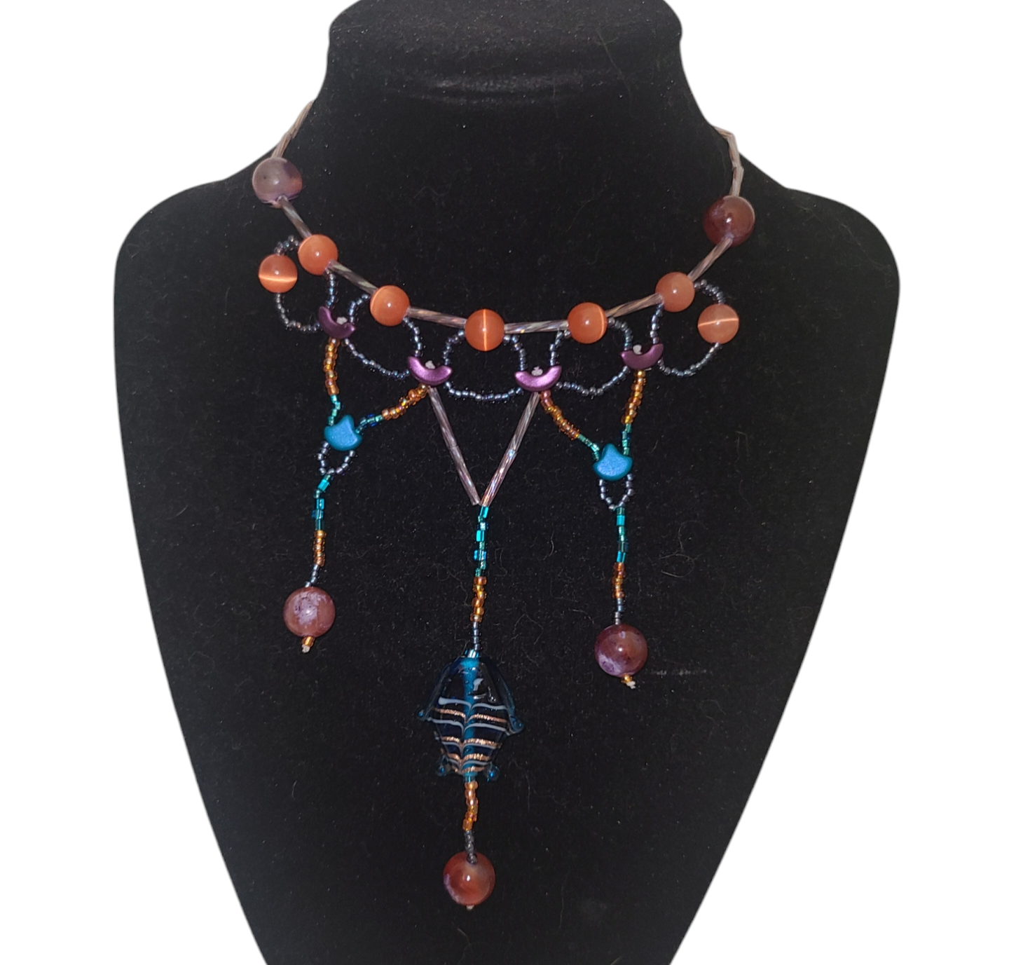 Teal looped beadwork frames the upper row of this necklace, supporting three delicate strands of orange and teal agate beads that extend just past the collarbone. A glass teal fish bead anchors the center strand, offering a subtle focal point.