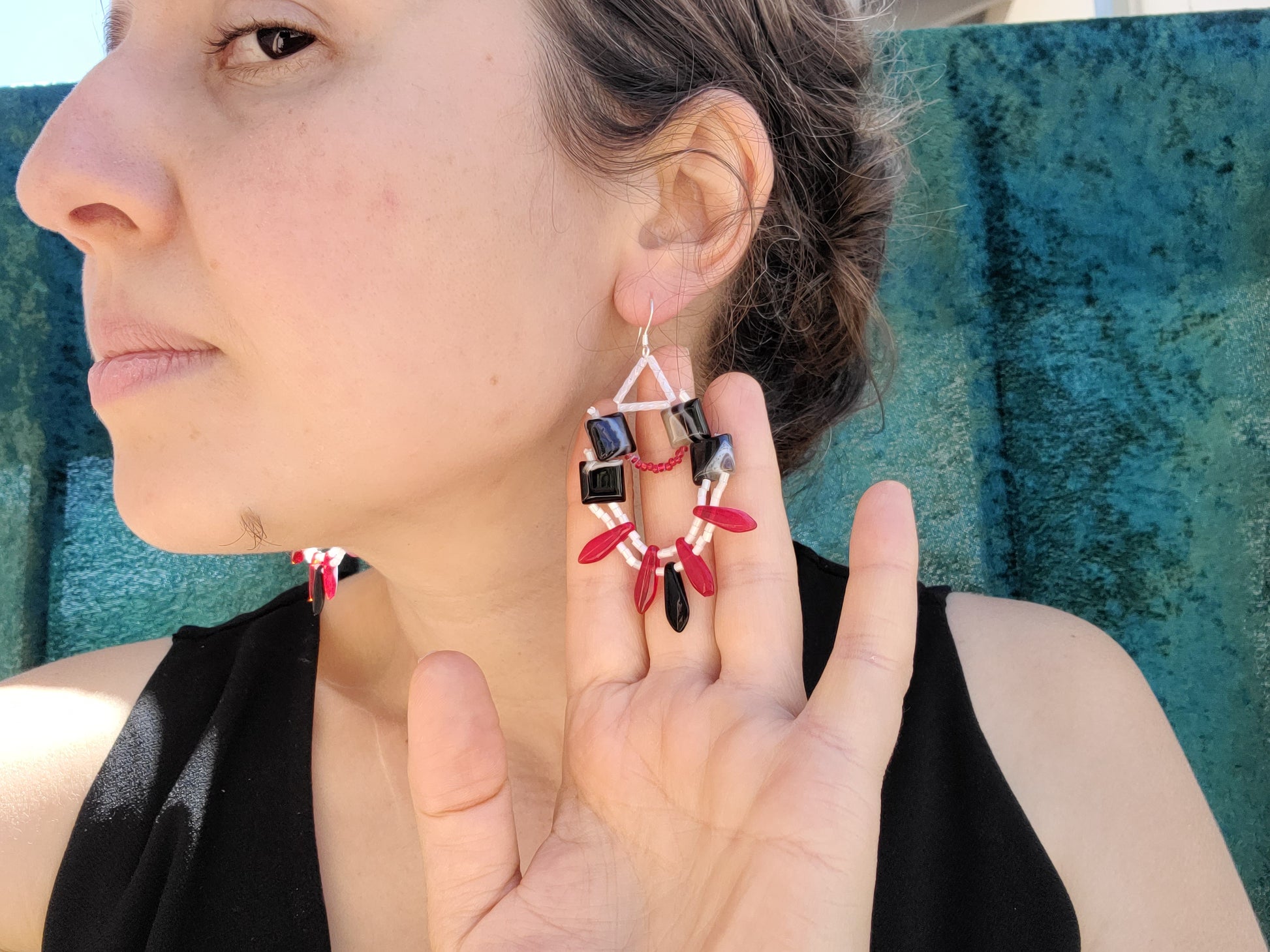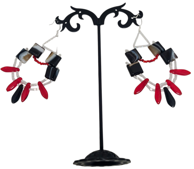 These bold statement earrings feature stacked striped agate stones supporting white beadwork with red and black glass focal beads. Wear them with a red blazer and black jeans for a night out, or with a crisp shirtdress for something punchy but pulled together.