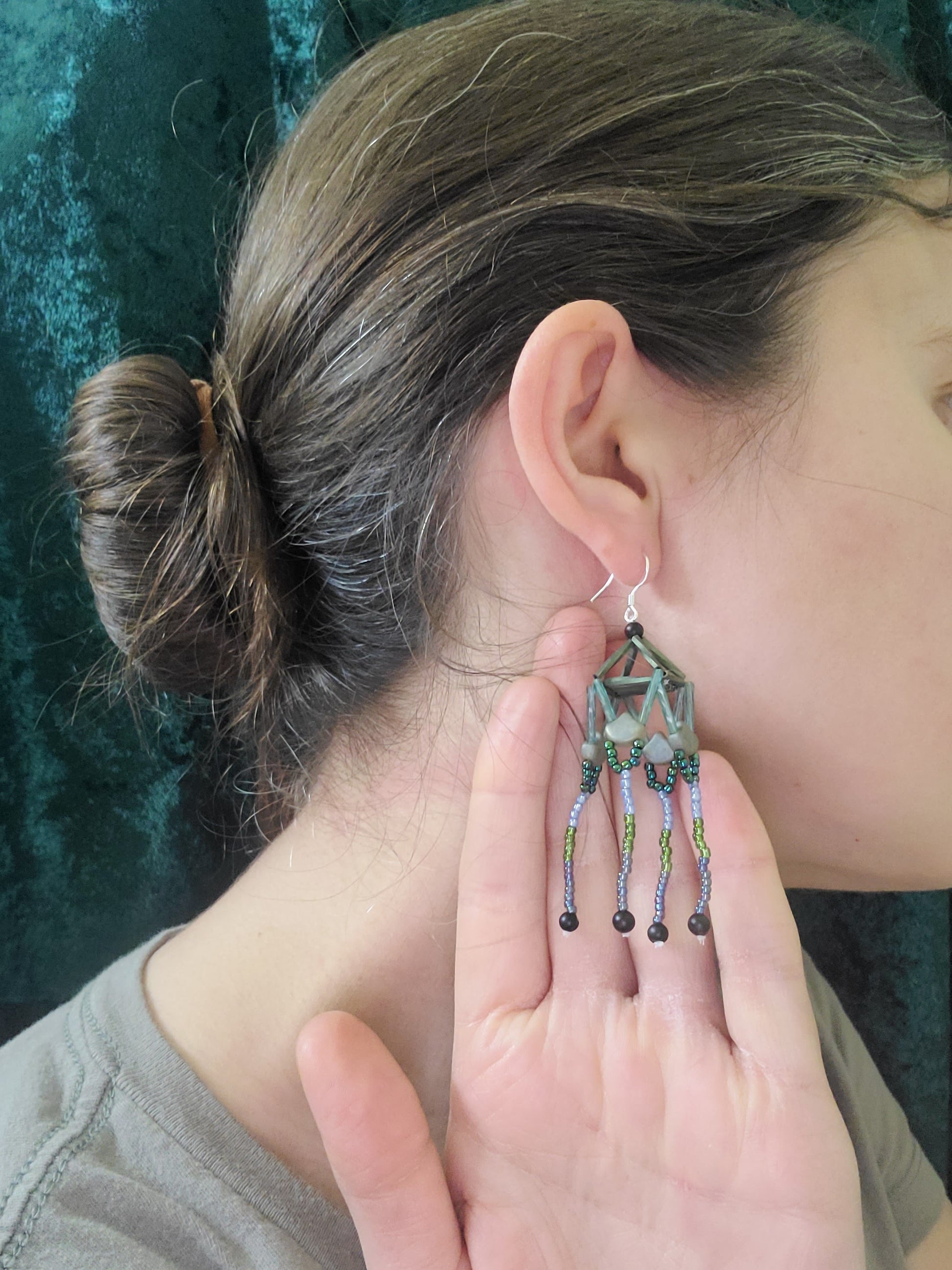 These earrings evoke architectural elegance with their black agate beads suspended in geometric 3D frames of deep green beadwork, inspired by the pagodas of southeast Asia. Cascading bead strands add movement, creating a dynamic interplay of shapes and textures. Pair them with a flowy maxi dress for a bohemian-inspired look or with a crisp white blouse and tailored pants for a polished, artistic edge at work or a dinner event.