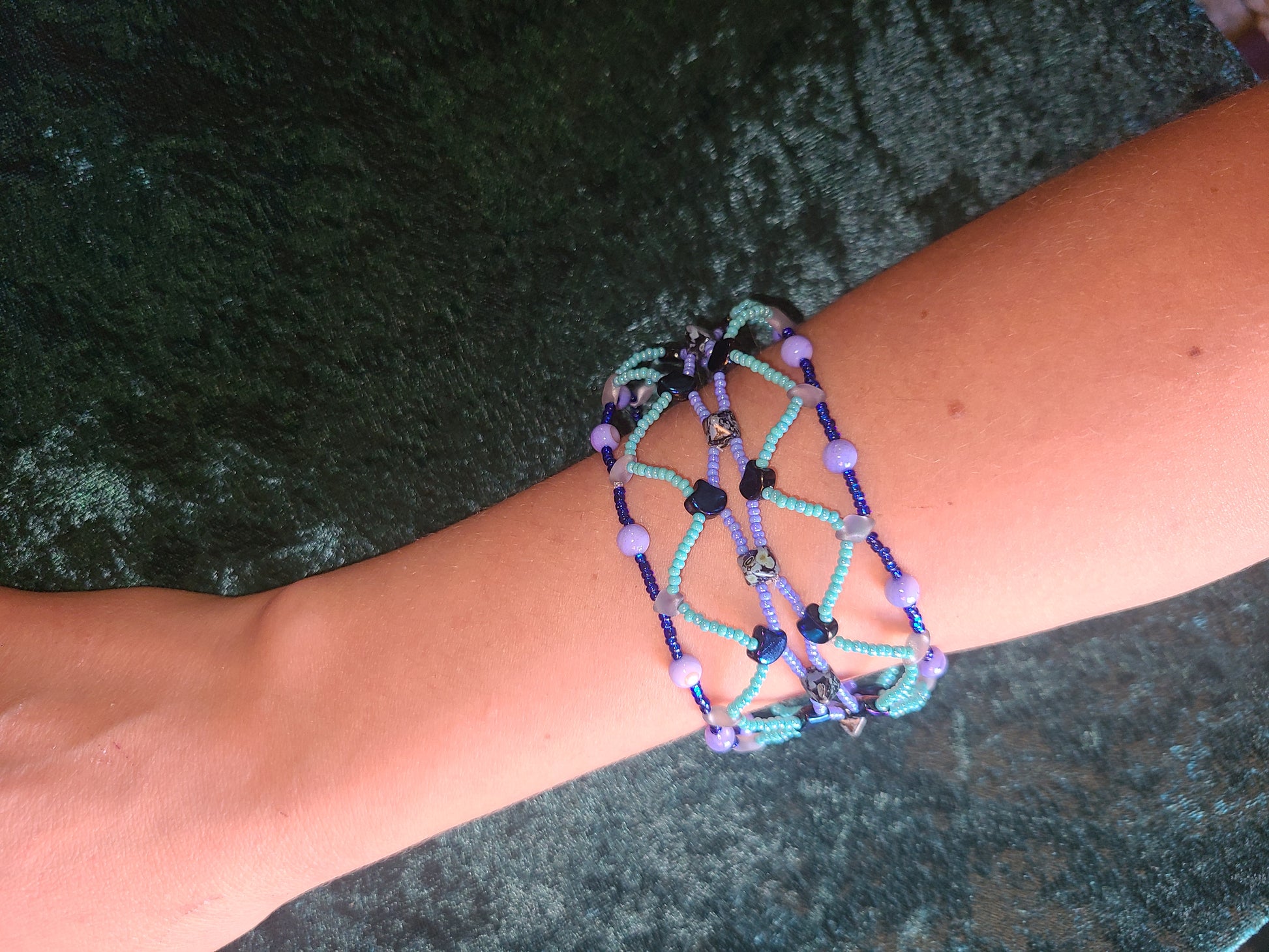 Dive into vibrant, free-spirited style with this eclectic, cool-tones bracelet. A harmonious blend of teal and blue beads weaves into a bold mosaic pattern, creating a striking accessory for any bohemian-inspired look. Pair it with flowing maxi dresses, festival-ready outfits, or even a simple tank top and jeans for an eye-catching contrast. Whether you're heading to a music festival, an art show, or a laid-back evening with friends, this bracelet celebrates individuality and artistic flair.