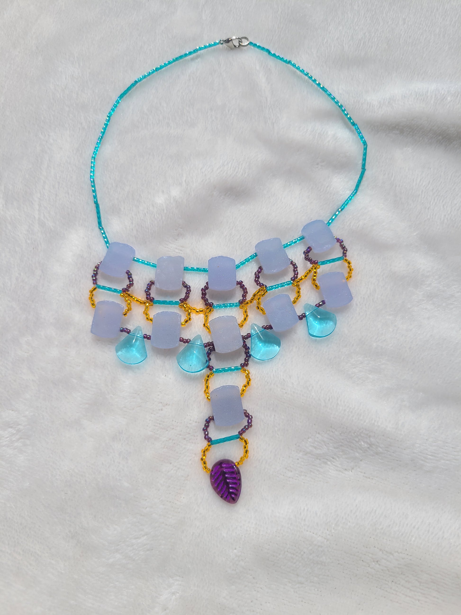 This necklace takes its shape from Moroccan silverwork, with a lattice of gold and teal beadwork framing matte blue chalcedony beads. Teal glass teardrops trace the base, while a purple glass leaf bead centers the design.