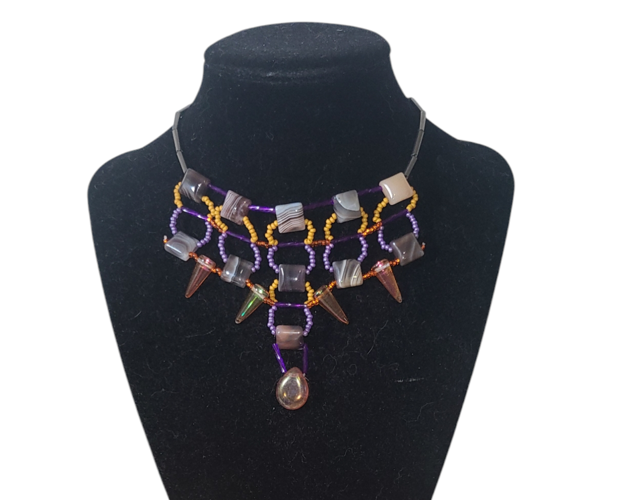 This necklace features banded Botswana agate stones set in a grid pattern, accented with deep purple beads and a single glass bead at the center. The design balances earthy tones with structured geometry for a clean, bold look.