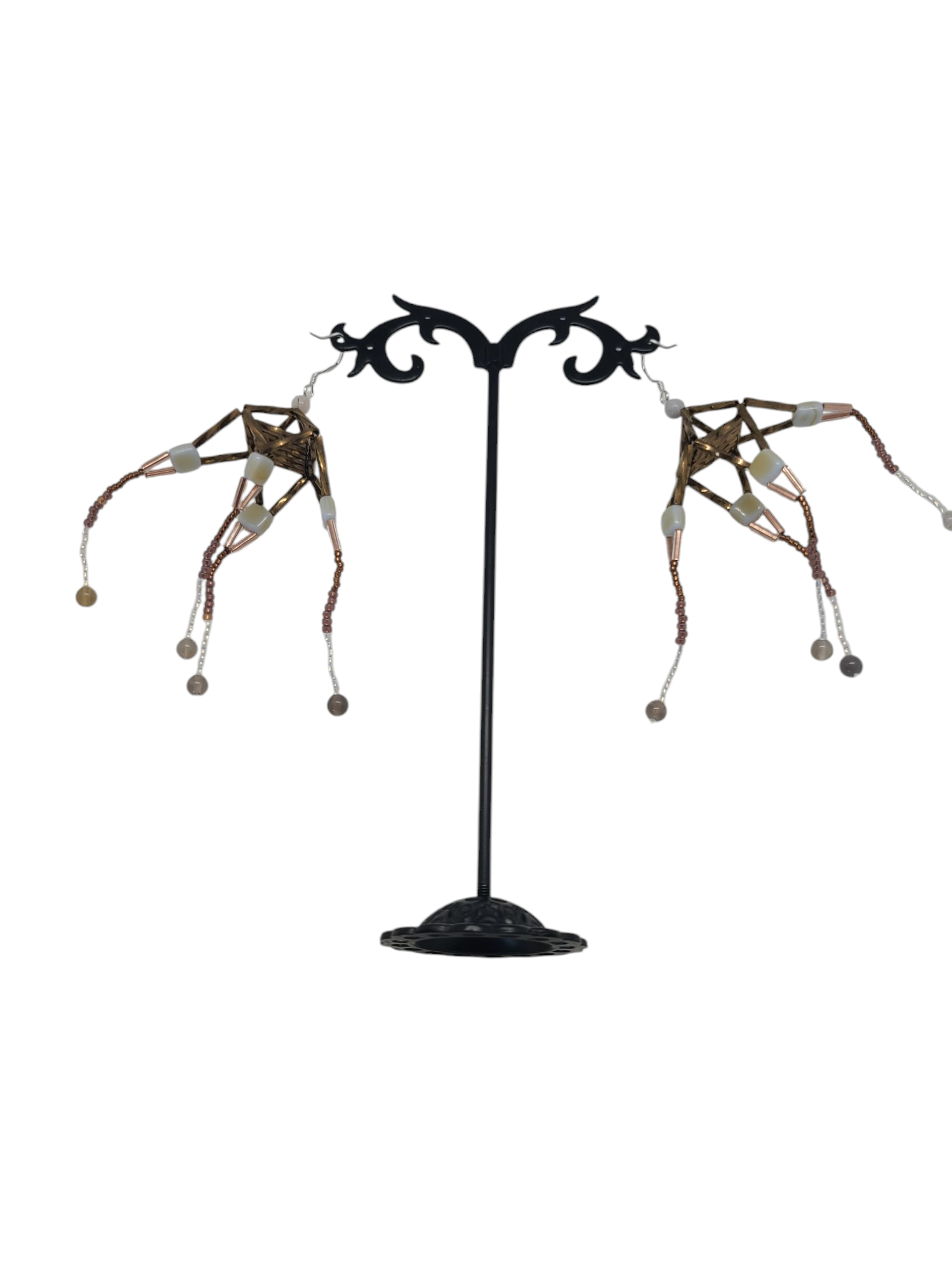 An architectural take on statement earrings, these pagoda-inspired pieces feature warm, neutral-toned Botswana agate paired with an angular geometric structure. Cascading beaded strands add a sense of movement, making them a dynamic choice for those who love jewelry with both structure and fluidity. Their earthy elegance makes them a great match for a linen jumpsuit or a draped maxi dress, perfect for an art gallery visit or a laid-back rooftop gathering.