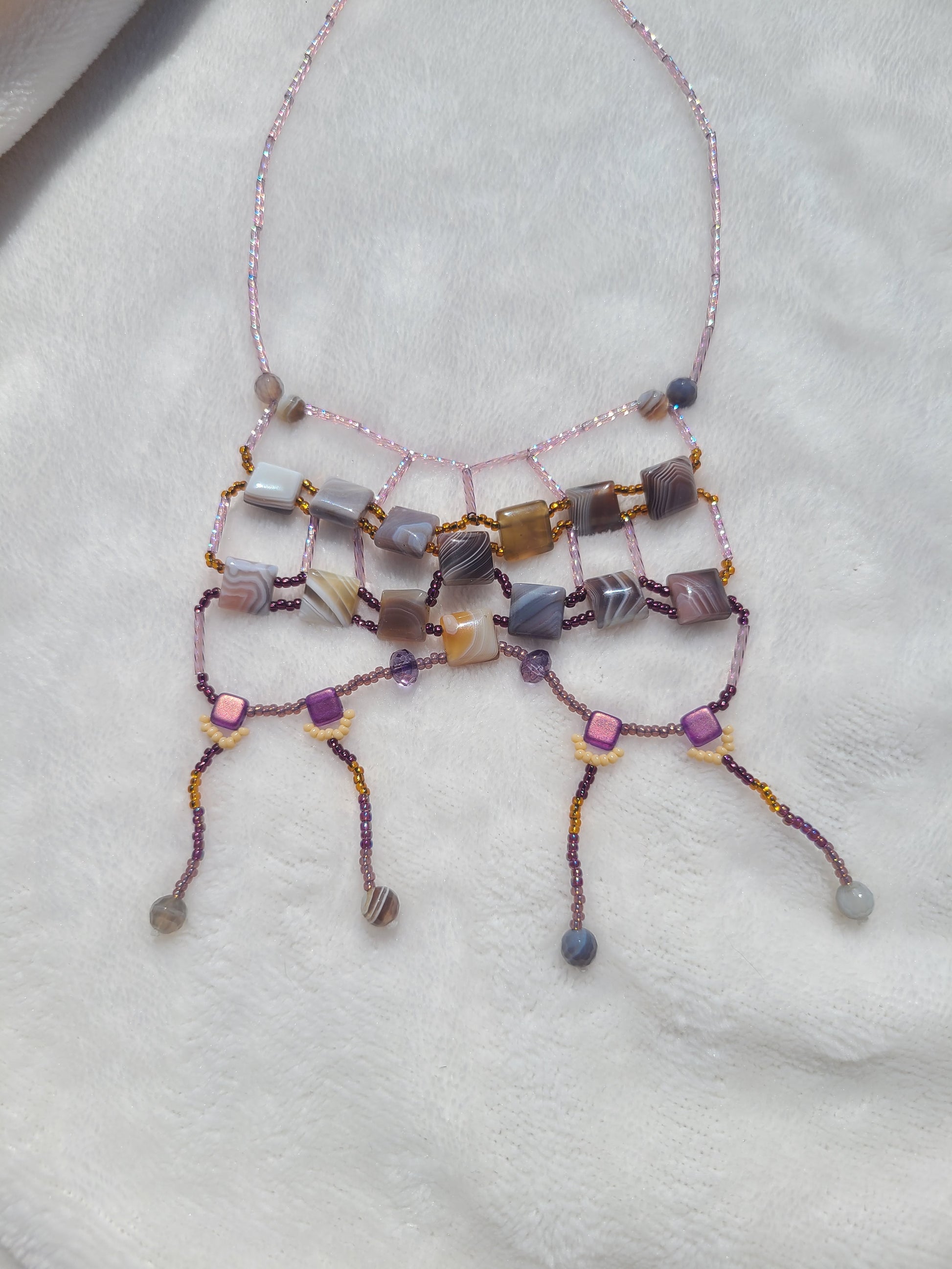 Smooth square-cut Botswana agate beads, each with its own soft banding and variation, anchor this structured beaded necklace. The stones are framed in mauve and ochre glass beads, with four delicate strands adding movement and contrast below. This necklace beautifully with a neutral knit or a buttoned silk blouse—ideal for client meetings, evening panels, or any time you want something grounded but visually intricate.