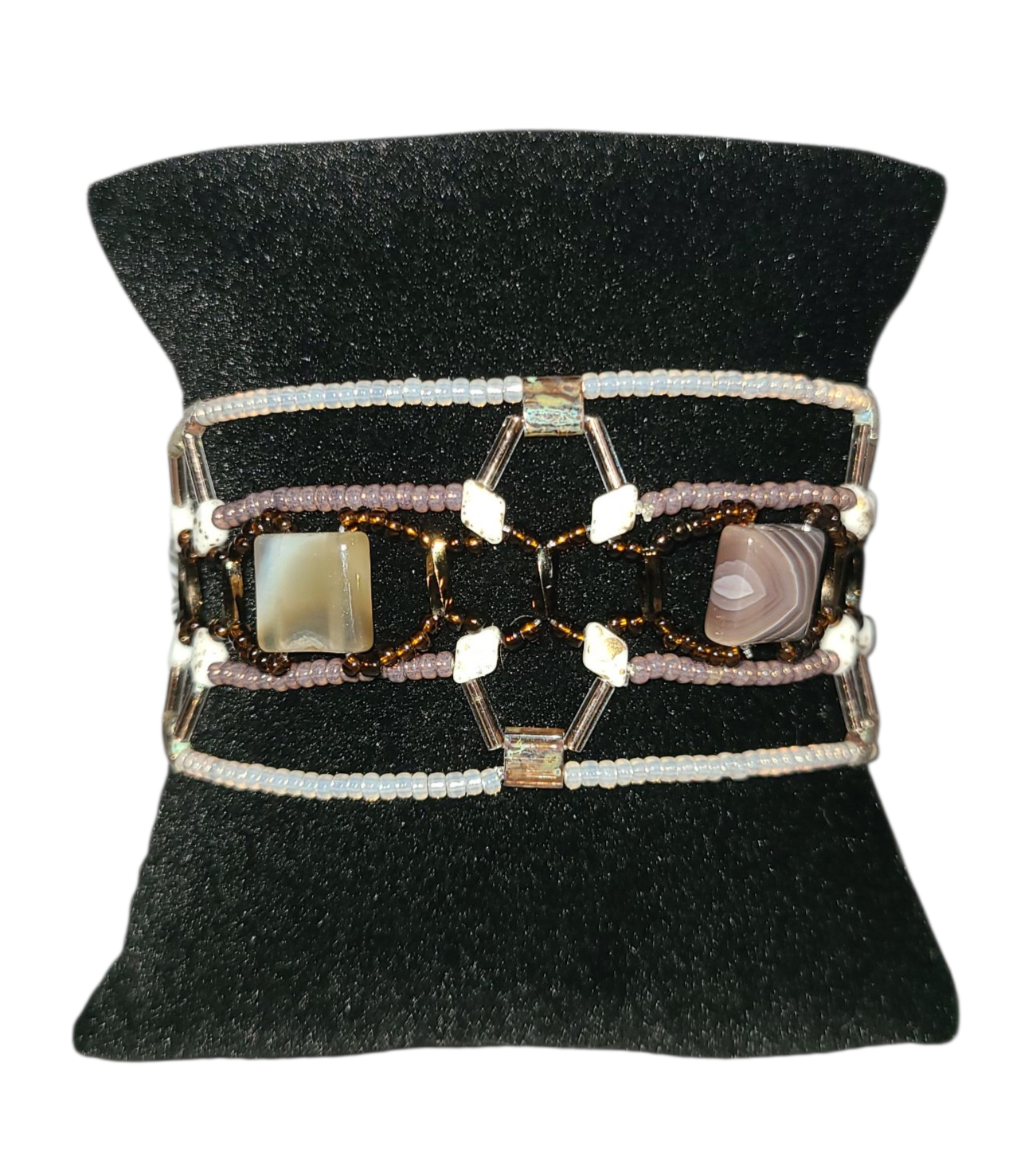 Purple, brown and white beadwork frames banded Botswana agate stones at the center. This versatile geometric bracelet pairs well with cream knits and dark trousers for winter styling.