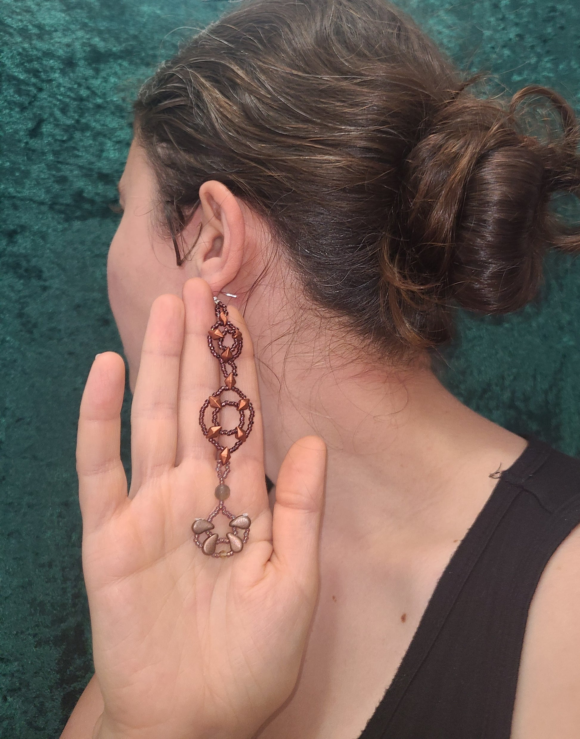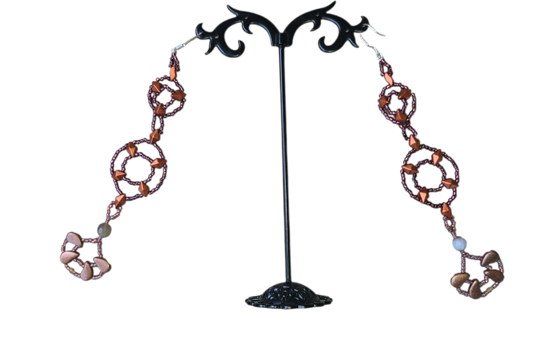 Warm plum and copper beadwork outlines alternating circular and diamond-shaped links, with softly banded Botswana agate gemstones accenting the joins. The elongated profile makes these geometric statement earrings flattering and easy to style, whether with a flowy midi skirt for brunch or an elegant monochrome outfit.