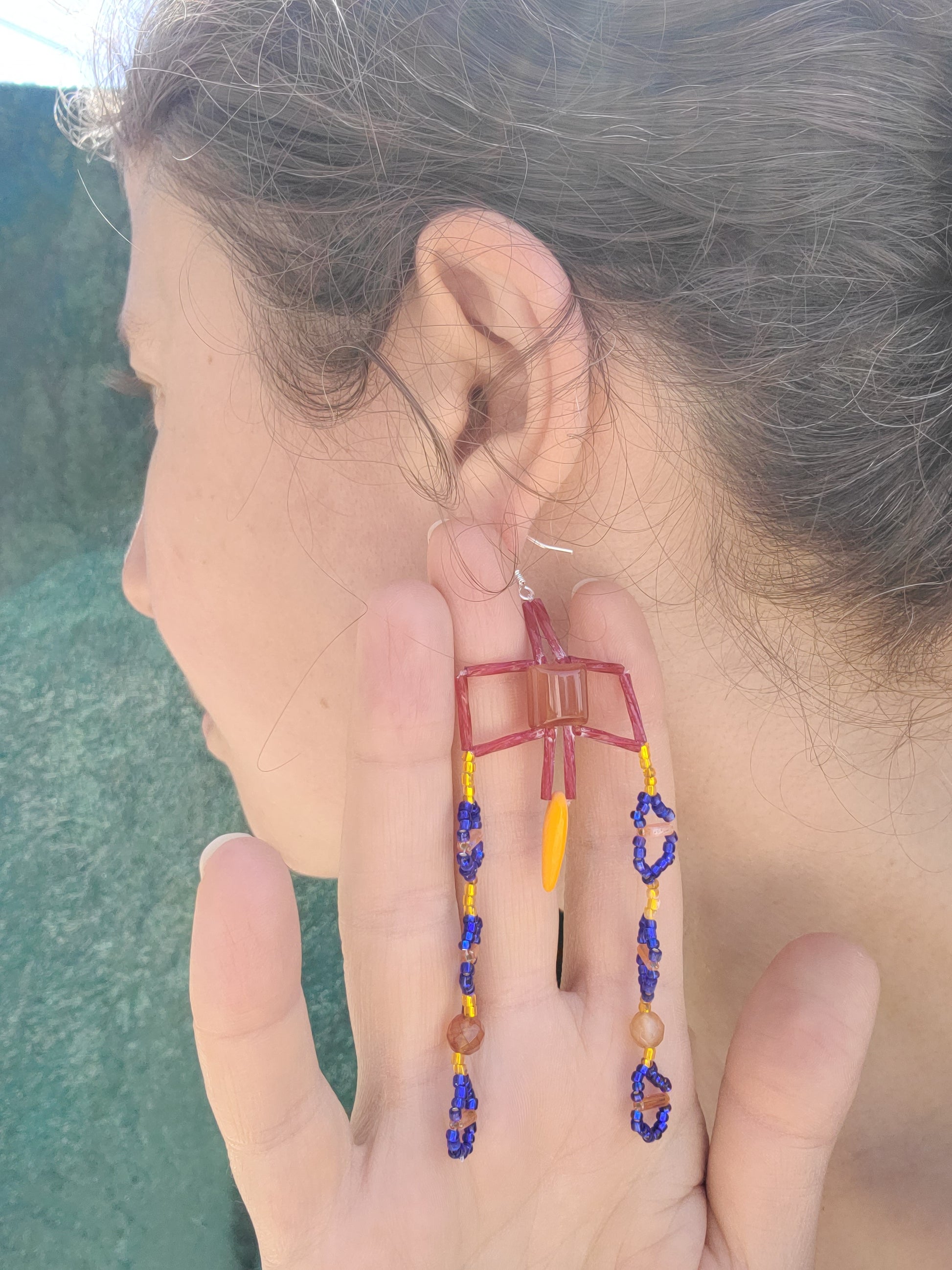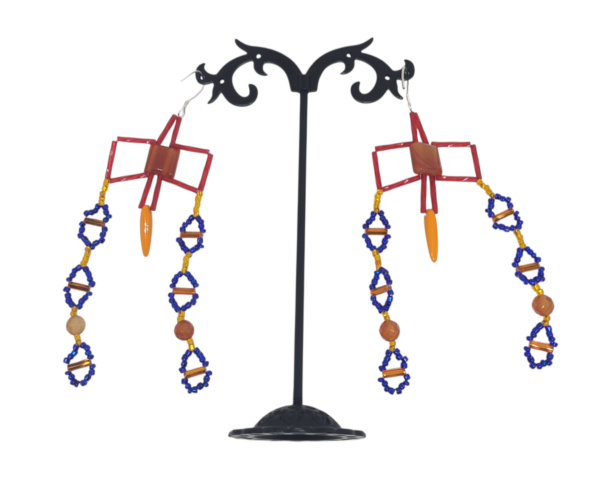 These bold geometric earrings feature a deep red cross design and rich orange carnelian drops, with cobalt and gold beaded fringe forming a symmetrical layout. The sharp angles and high-contrast colors make these a standout pair of carnelian statement earrings with structure and presence. Wear them with a black turtleneck and wide-leg trousers for a gallery opening, or pair with a jewel-toned wrap dress for a night out.