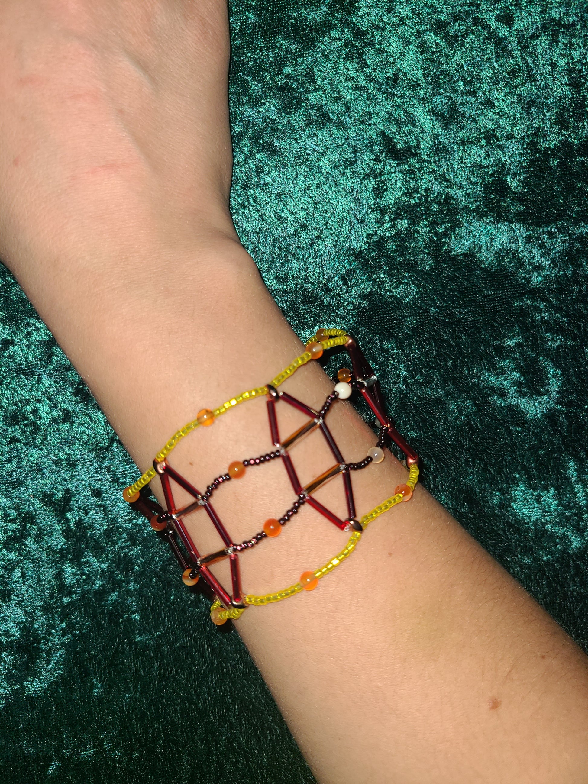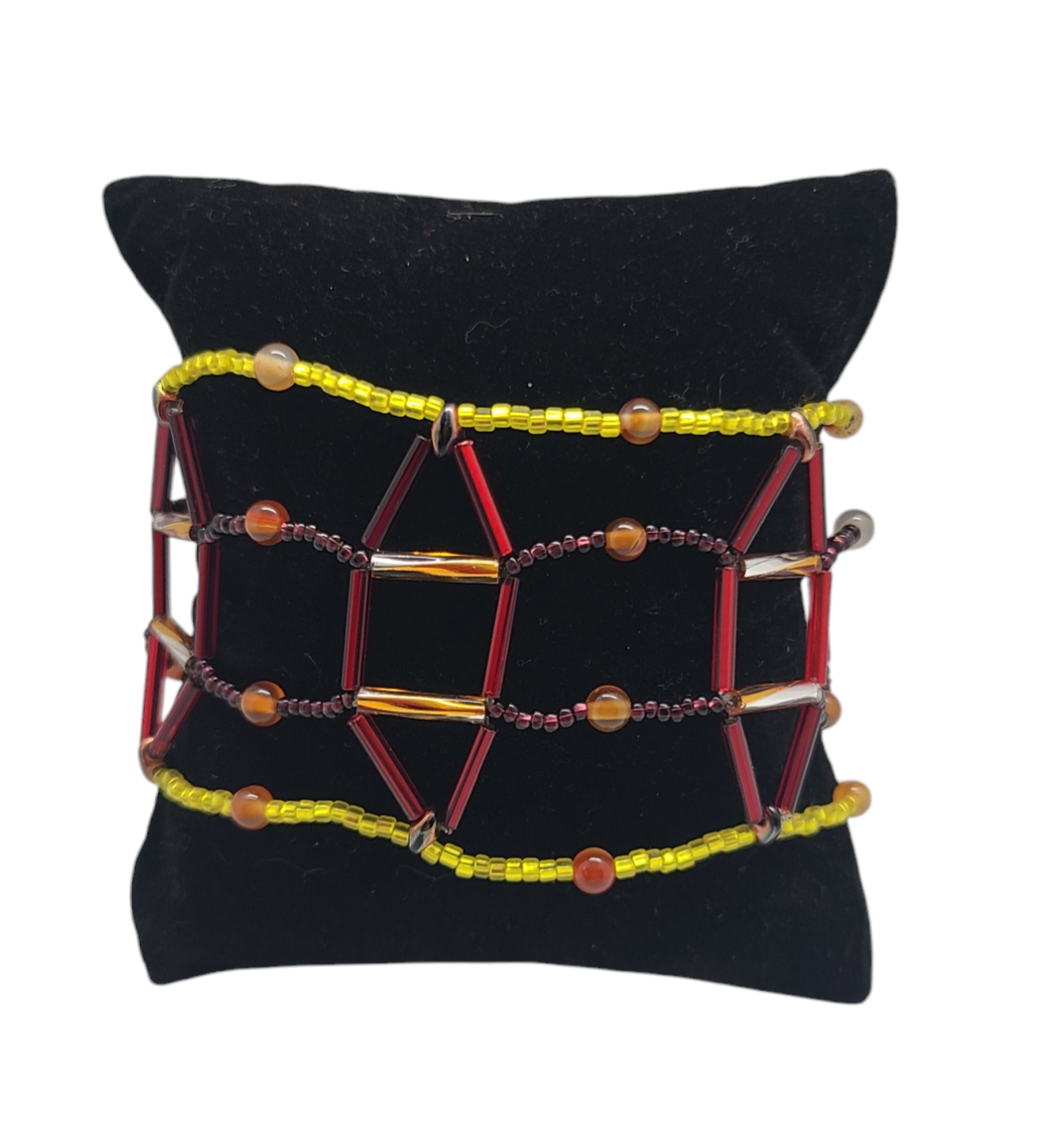 Make a bold statement with this bracelet, featuring vibrant carnelian gemstones in deep orange and rust hues. The geometric mesh pattern is accented with ruby-red glass tubular beads and golden seed beads, creating a warm, autumn-inspired palette. This bracelet pairs beautifully with earthy tones, cozy knitwear, or tailored blouses. Ideal for fall festivals, outdoor gatherings, or casual holiday celebrations, it adds a touch of rich, seasonal color to your outfit.