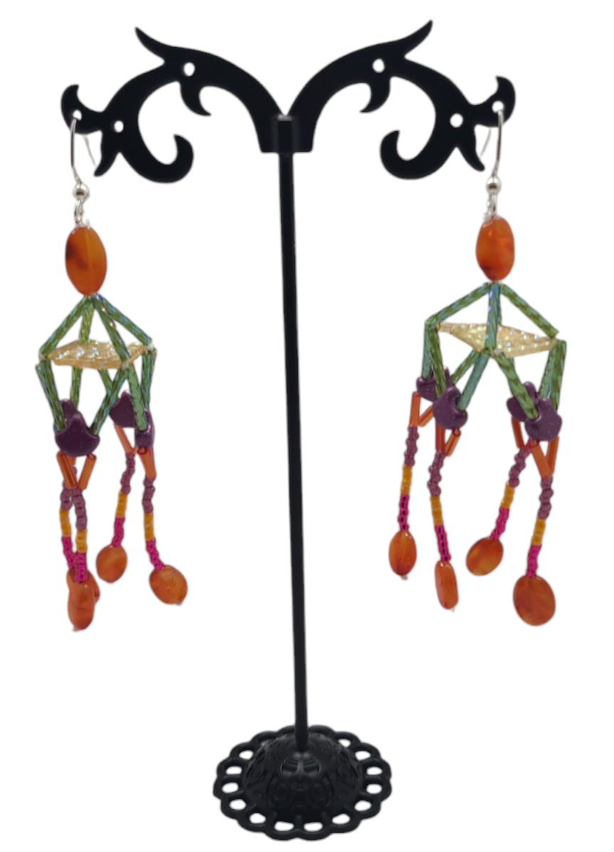This earring design is evocative of the striking pagodas, or multi-tiered towers in much of Asia. This design features flame orange carnelian at the top and base, with detailed multi-colored beaded dangles along each side.