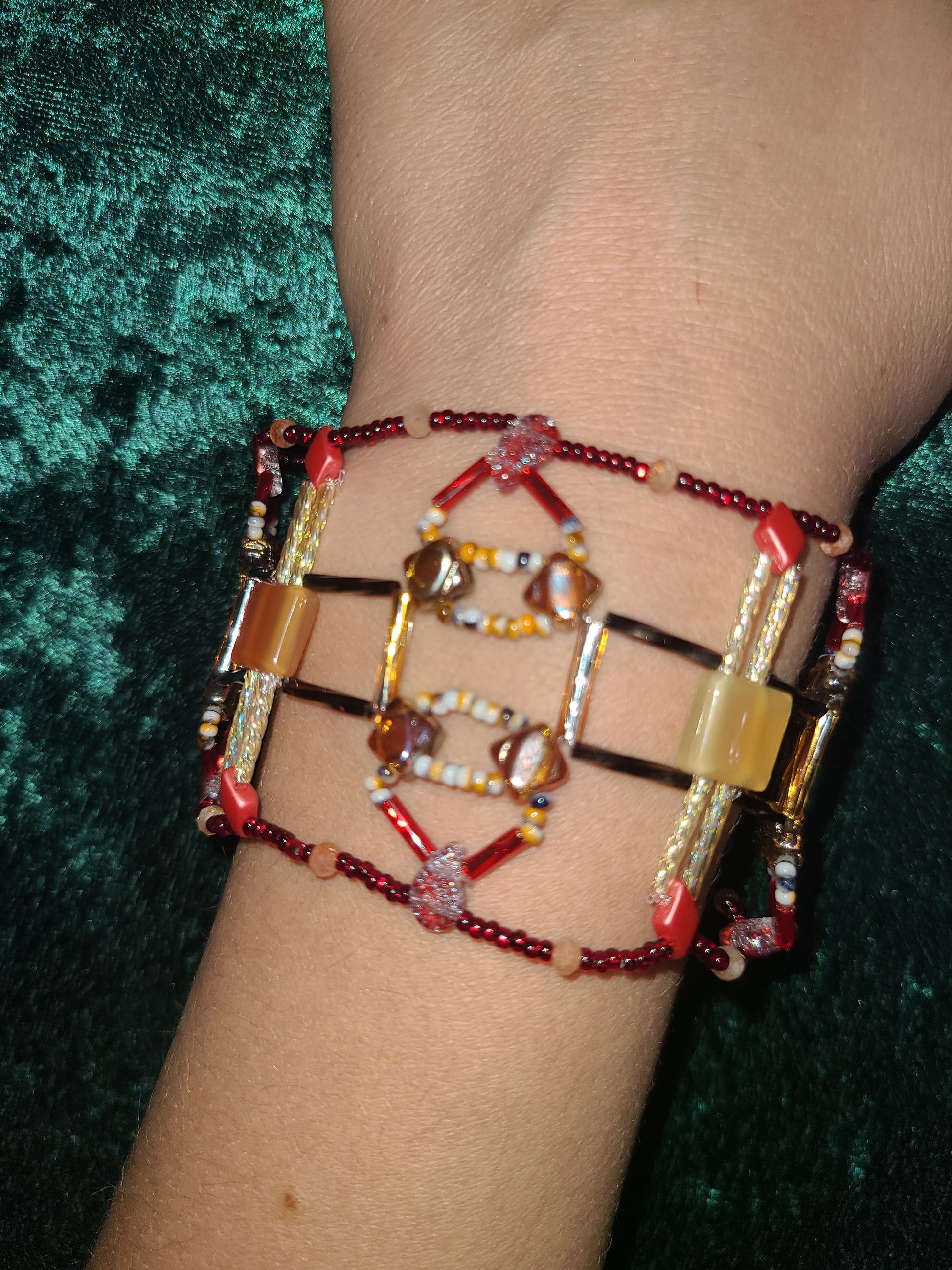 This bold statement cuff bracelet features rich orange carnelian stones centered in a geometric matrix. Vibrant orange and deep red beads create dynamic connections between carnelian focal beads, while glass and sunstone beads accent the structured design. The sophisticated lattice pattern makes this piece equally striking worn solo or stacked with other architectural pieces.
