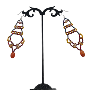 These earrings feature carnelian focal beads anchor a layered design built from warm-toned glass in soft blush, brick red, and ochre. The beadwork fans outward and upward in a tiered shape that brings color and structure without weight. Wear them with a rust-colored blouse and dark denim for a gallery opening, a casual dinner, or anywhere you want a pop of bold, earthy elegance.