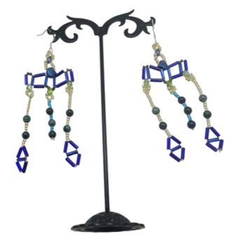 Inspired by Roman Crotalia earrings, this design features genuine chrysocolla beads in vivid shades of teal and turquoise. A structured framework supports three cascading strands of faceted and smooth beads, creating elegant movement with every step. The intricate beadwork and historical influence make these earrings a bold yet timeless statement. Wear them with a navy wrap dress for a coordinated look or a crisp white blouse to let the colors stand out. Perfect for cultural events, evening gatherings, or adding an artistic touch to your wardrobe.