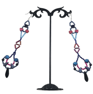 Vibrant cobalt blue and hot pink beads are arranged in bold geometric shapes, with diamond frames, circular accents, and dangling black teardrop beads, to form a delicate drop design. The design’s angular symmetry adds modern appeal, while the bright colors make a statement. These earrings are perfect for festivals, creative gatherings, or pairing with a monochrome jumpsuit to let their bold colors shine.