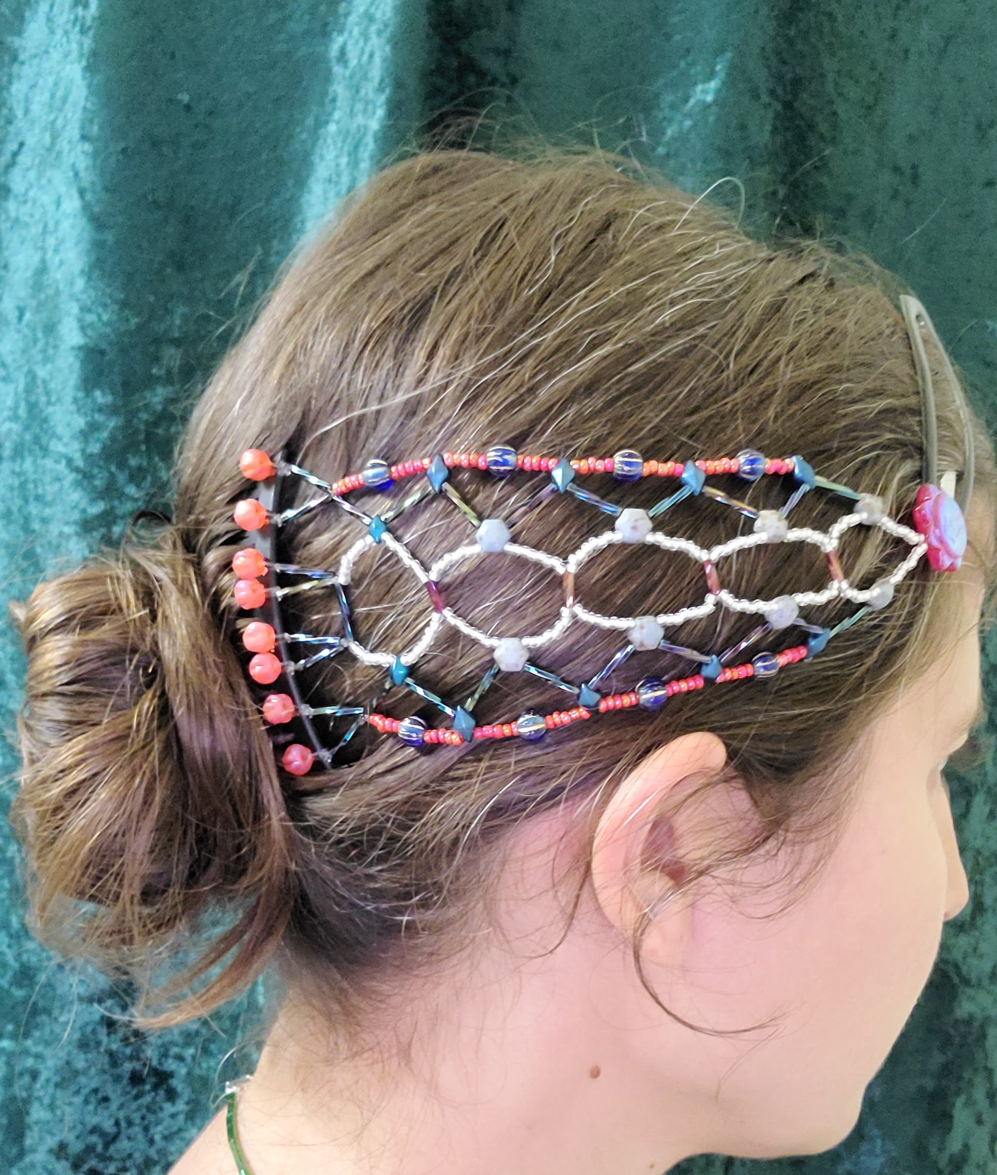 This hair accessory is adorned with a comb embellished with coral glass beads. The intricate beadwork, featuring a zigzag pattern in white, coral, and blue, is expertly secured on the side of the head using a no-slip barrette with a red glass sun bead.