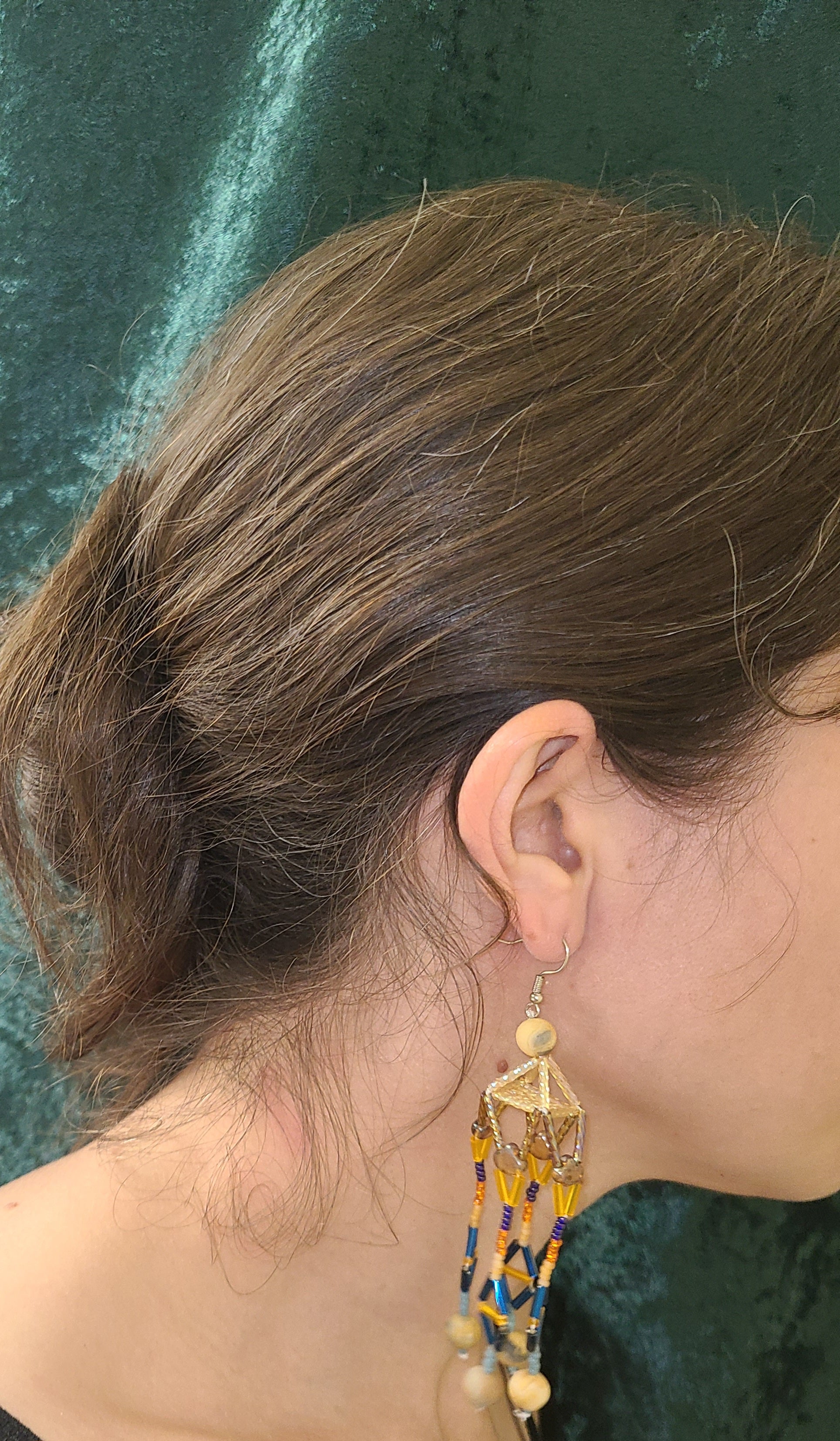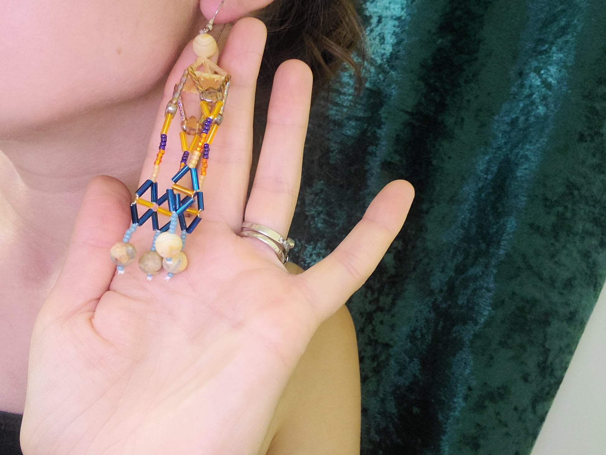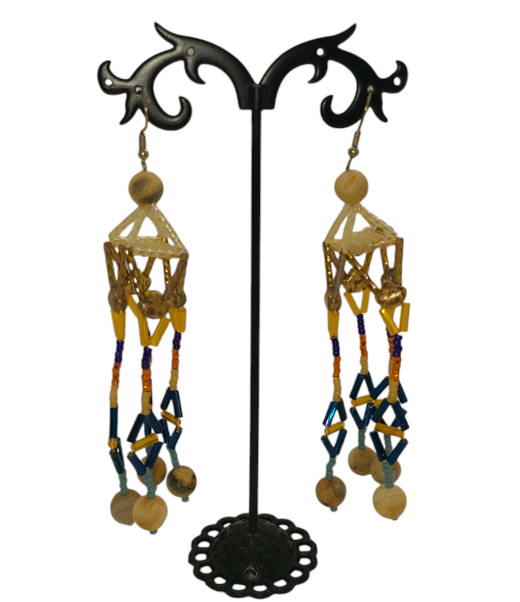 This earring design is evocative of the striking pagodas, or multi-tiered towers in much of Asia. These earrings feature crazy lace agate, with a color palette evocative of a beautiful desert landscape.