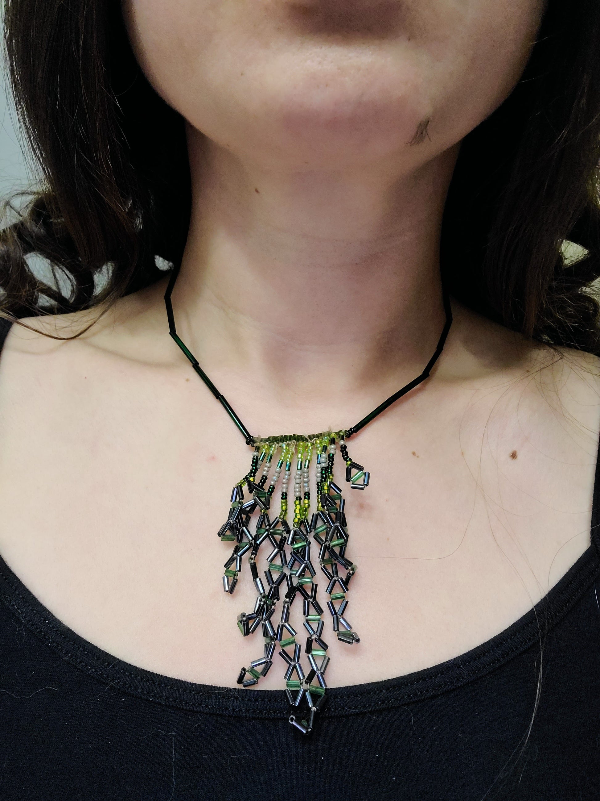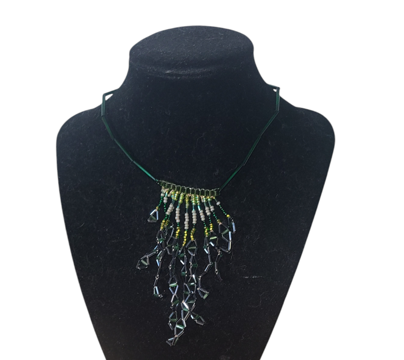 This necklace evokes the serene vibe of a lush forest. Its cascading design features shimmering green fringed beadwork and fluid movement, evoking the feeling of gentle rain falling through the trees. Ideal for nature lovers looking to add a touch of elegance to their wardrobe.