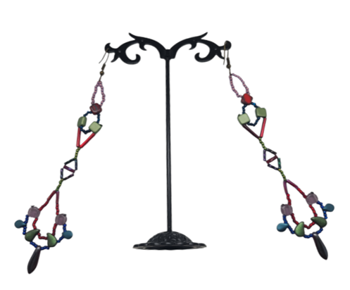 These delicate dangly earrings feature detailed geometric beadwork accented with glass beads in deep cool jewel tones. These earrings have a mesmerizing visual effect as they sway to catch the light.