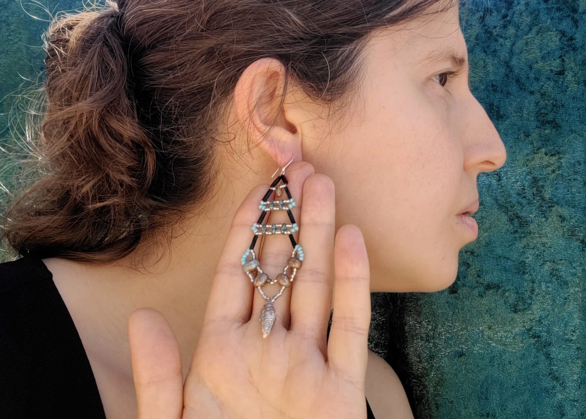 Stacked black triangles hold rows of sea-glass green, bronze, and soft blue beads, finished with a beige whelk glass drop. The structure is clean and rhythmic, while the palette leans earthy with a subtle ocean feel. Pair them with a patterned wrap skirt or a deep teal blouse—they’re easy to dress up or down without losing their edge.