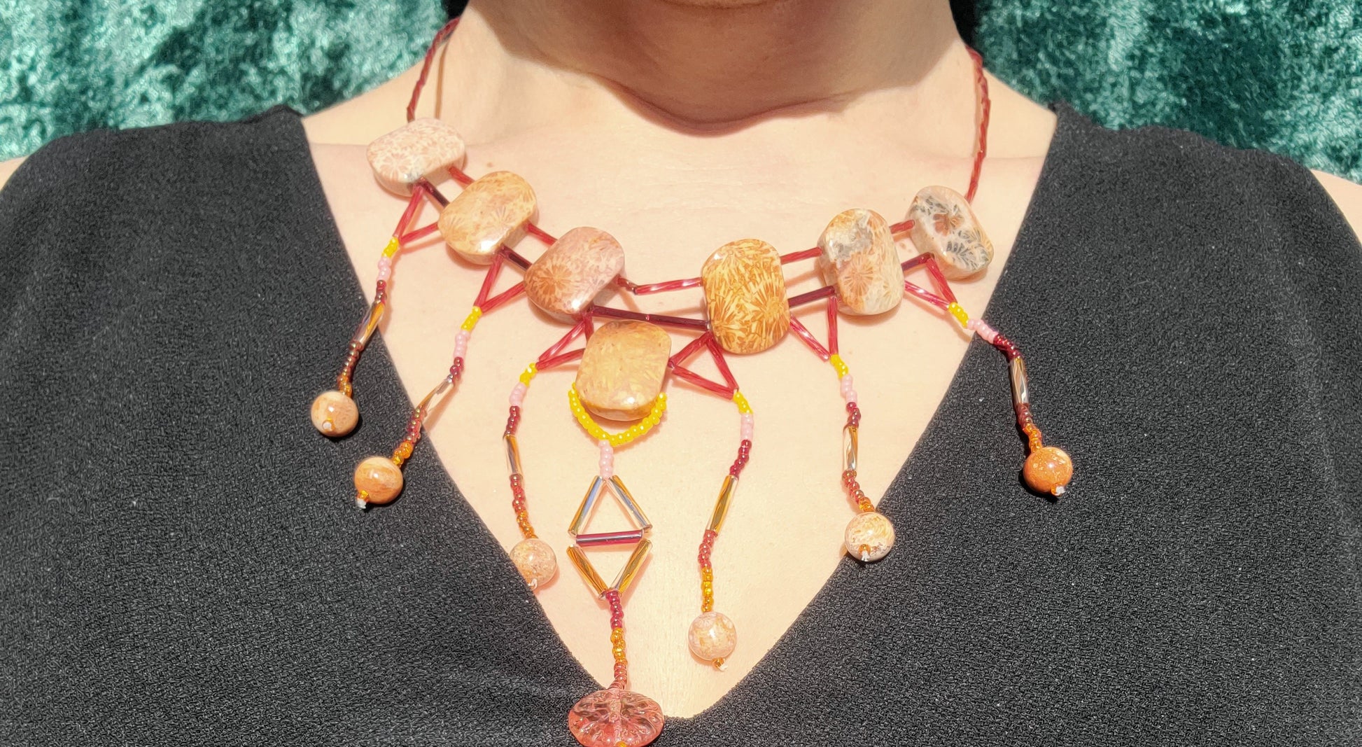 This necklace features rectangular fossil coral beads, each with distinctive natural patterns, linked by intricate beadwork in warm red, orange, and amber tones. Strands of beaded fringe extend from the base, ending in smooth fossil coral drops that add movement and texture. A central geometric accent draws the eye, creating a balanced yet dynamic design. Wear it with a rust-colored wrap dress or a linen blouse in warm neutrals for an effortlessly polished look. Perfect for an art gallery event, a casual evening out, or any setting where you want a statement piece with an organic, earthy appeal.