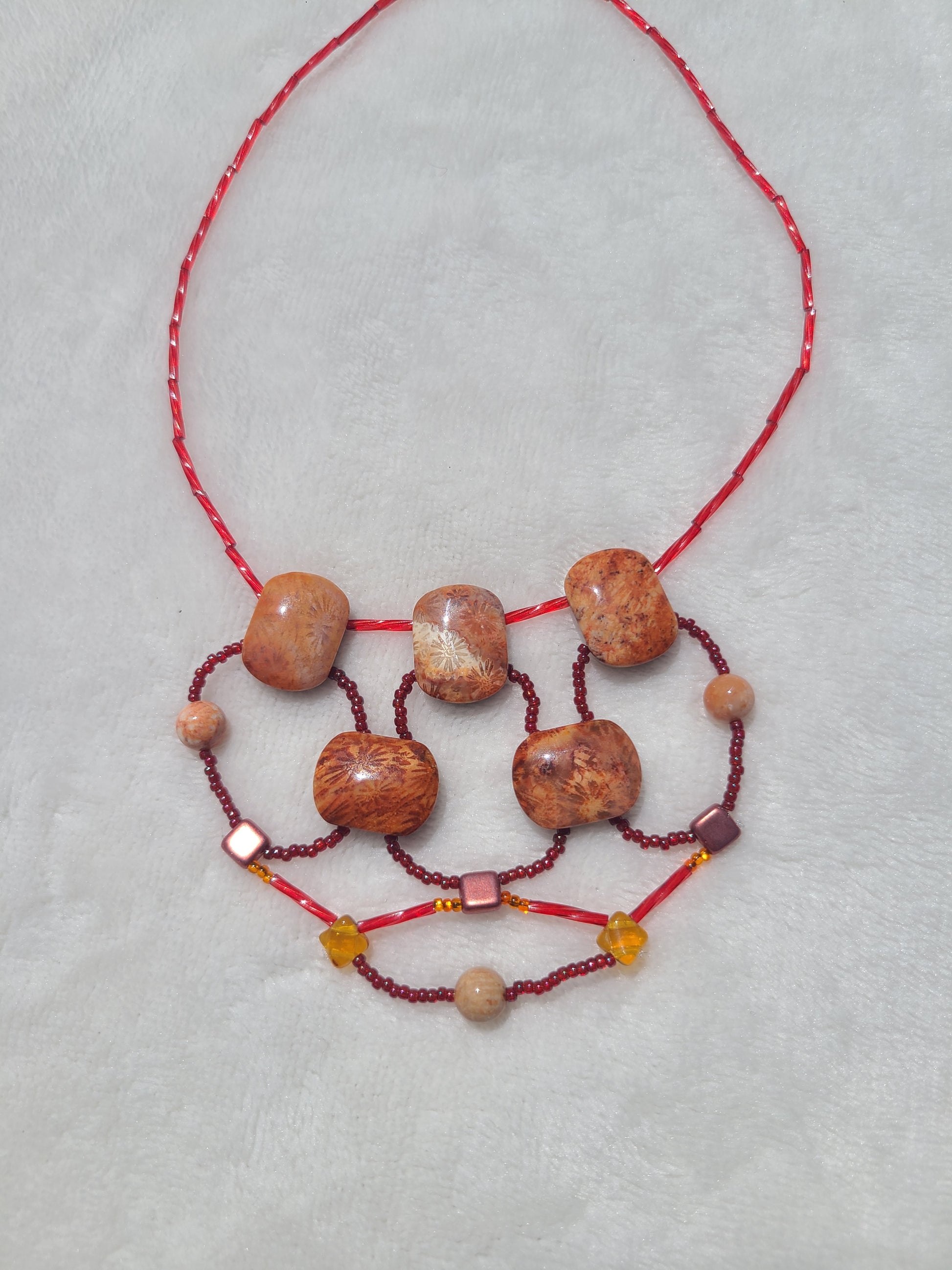 Fossil coral stones in soft rust, warm ivory, and golden beige form the centerpiece of this balanced necklace. The design flows into interlocking loops of glass beads in terracotta, peach, and deep red, creating a warm palette that’s visually rich yet effortlessly wearable. Its symmetry and color layering give it a grounded, sculptural presence.