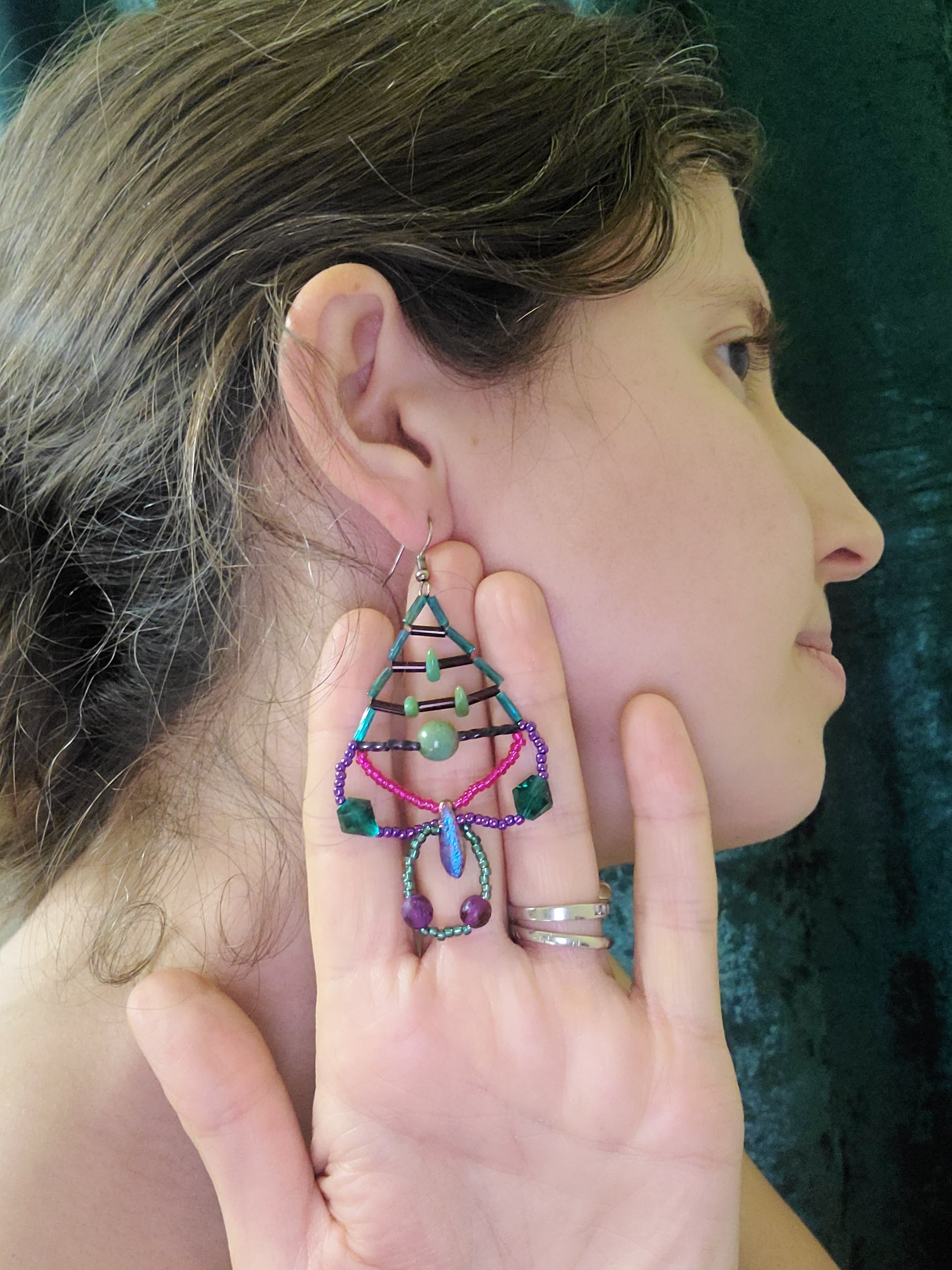 These teardrop earrings feature a unique trellis design accented with glass teardrop beads in a fuchsia and teal color palette.