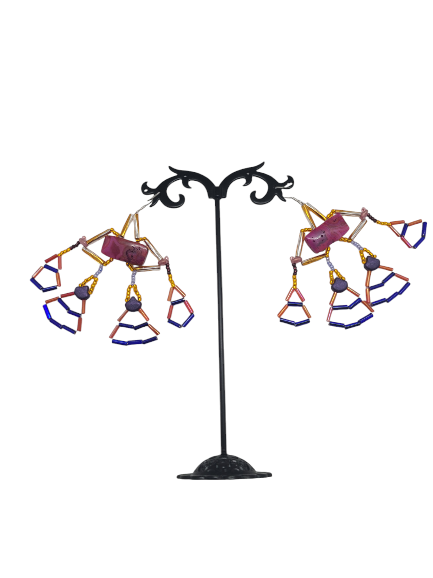 Structured like a modern skyline but with lots of color and movement, these bold dangle earrings feature a fuchsia crazy lace agate at the center, accented by stacked geometric beadwork in vivid purple and orange tones. Despite their dramatic look, they’re lightweight and wearable—perfect for days when you want your accessories to do the talking. Pair them with a minimalist black dress or jumpsuit for dinner downtown, art openings, or any event where bold jewelry belongs in the spotlight.