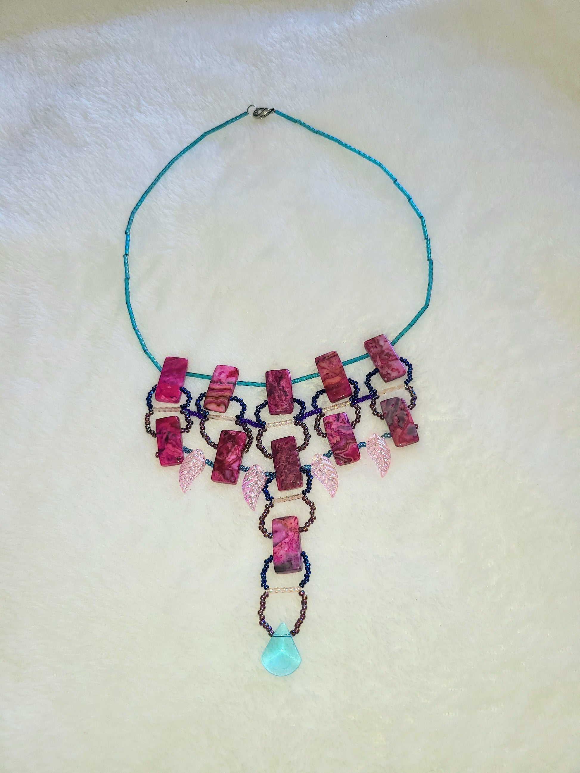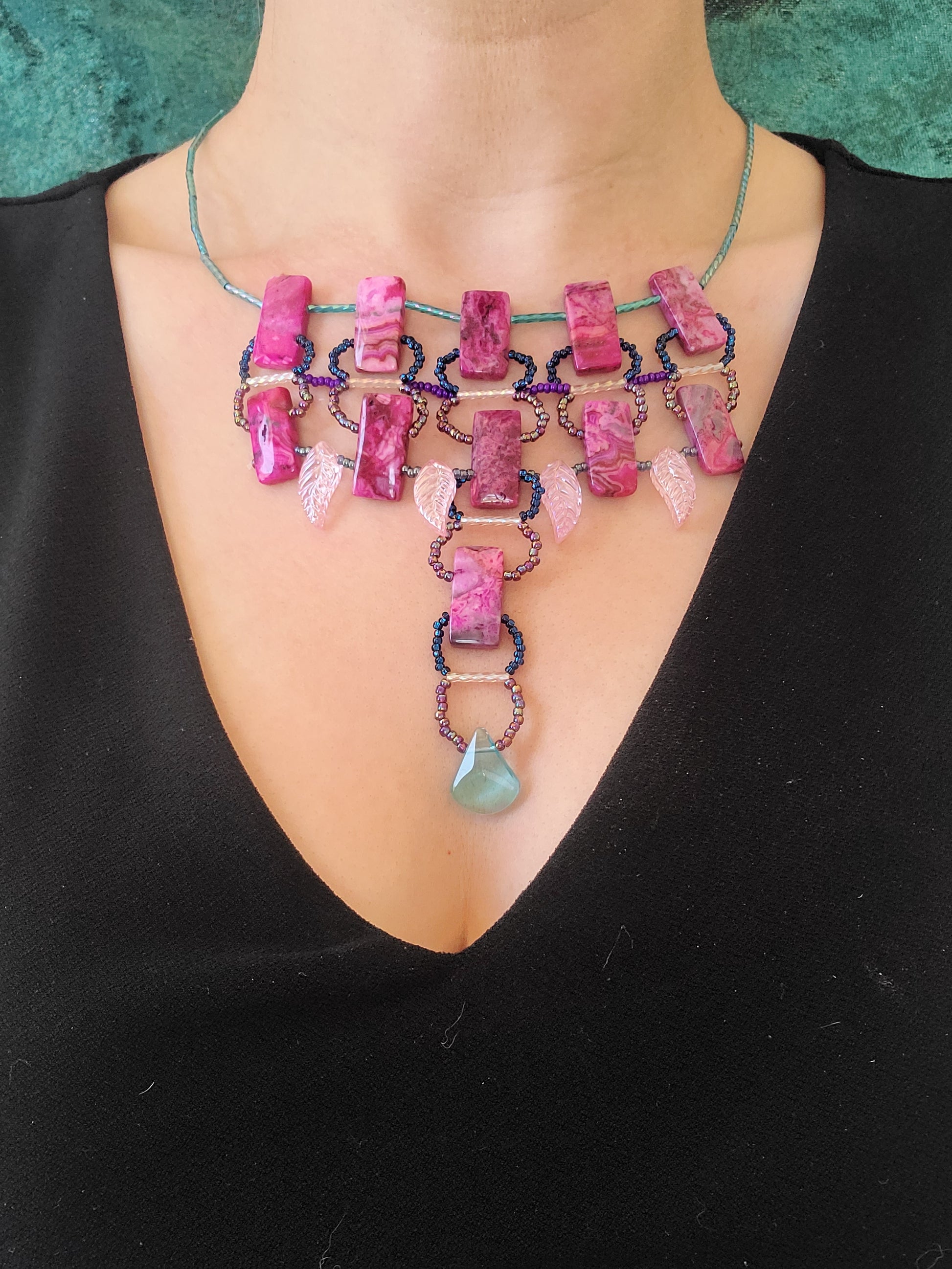 This one takes a cue from traditional Moroccan silverwork—structured, layered, and built to stand out. Bright fuchsia agate stones form the backbone, with leaf-shaped glass beads adding a bit of swing and texture. The shape is bold, but the vibe stays playful thanks to the electric color mix. It works best with a simple neckline—think black or gray crew necks or a scoop-neck tee—anything that lets the piece carry the moment. Great for rooftop drinks, gallery nights, or anytime you want your jewelry to spark a conversation.