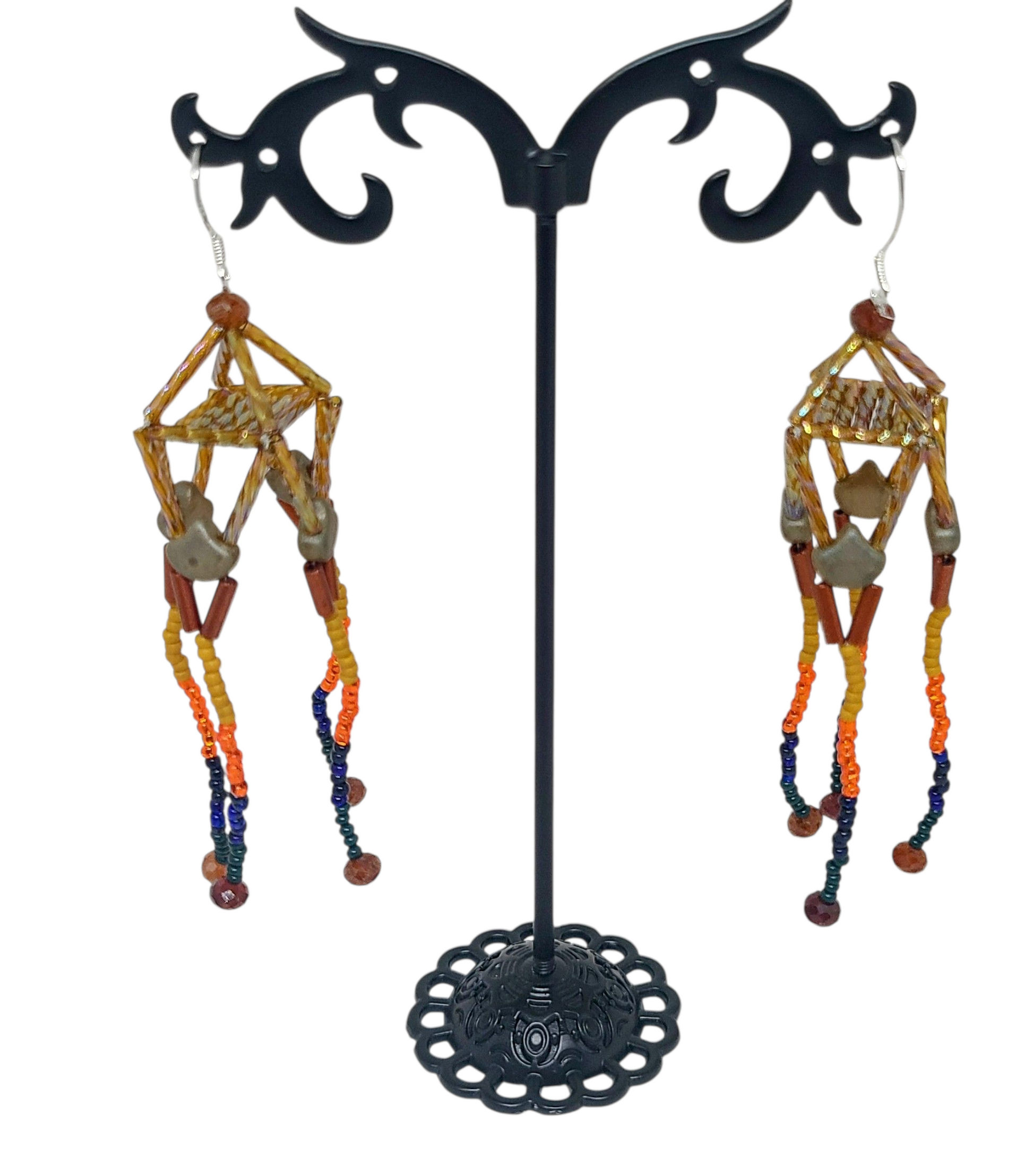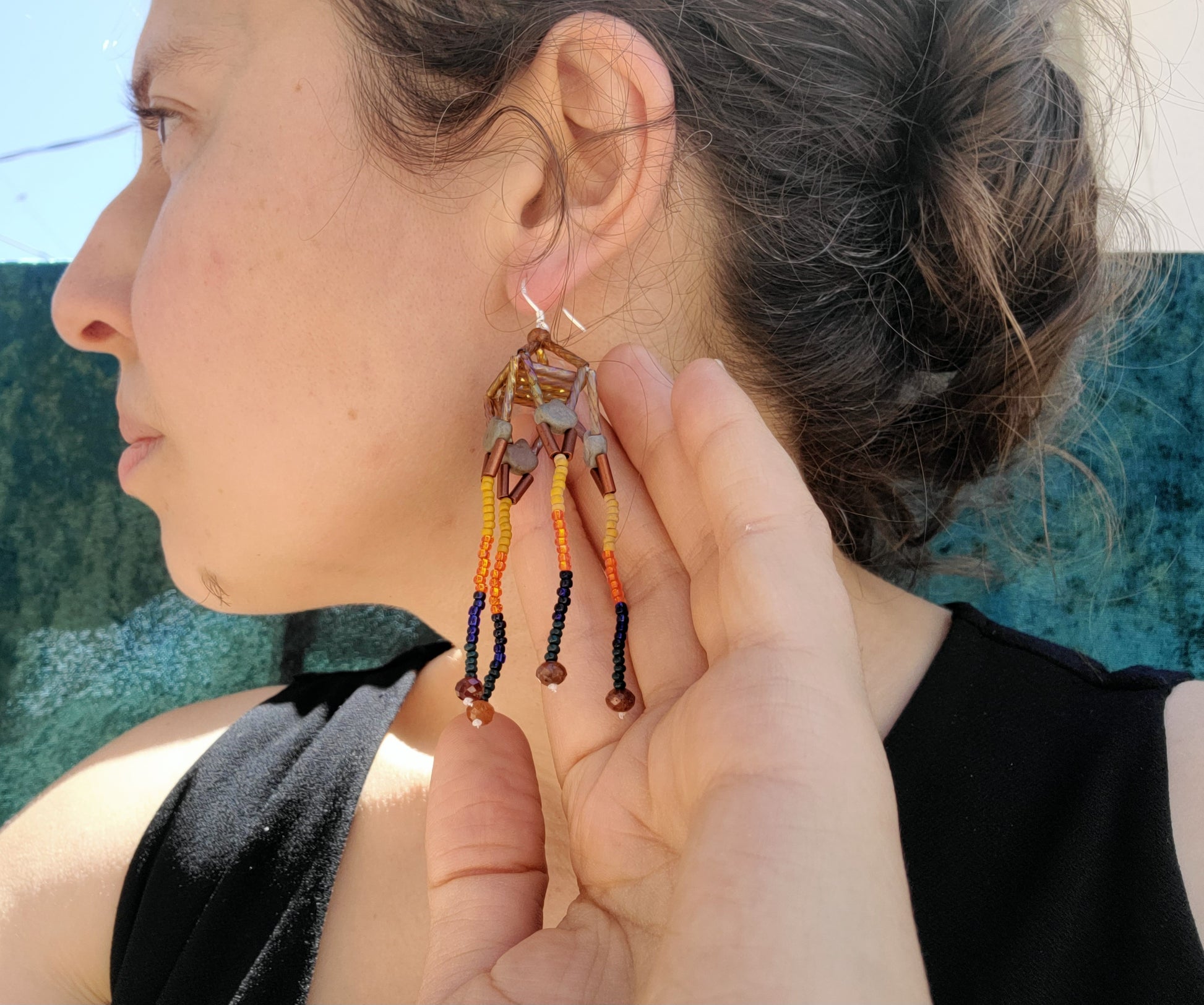 Golden hessonite stones and warm-toned beads stack into a tiered structure evocative of southeast Asian pagodas, with deep blue and orange accents.
