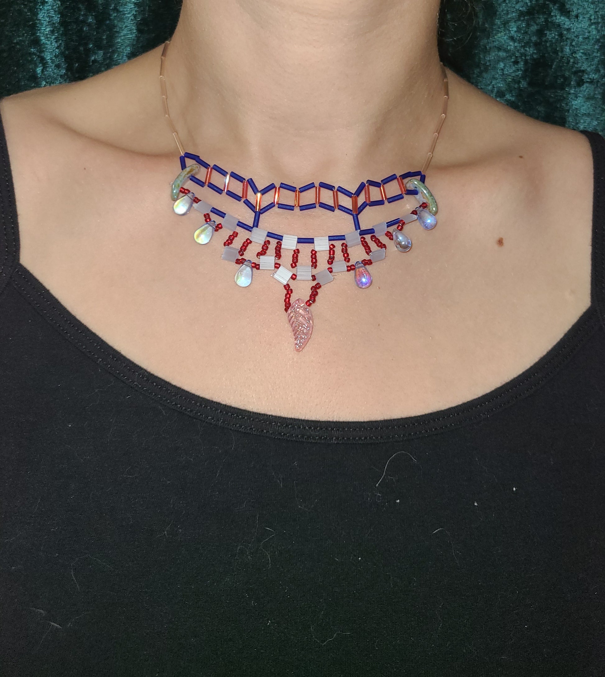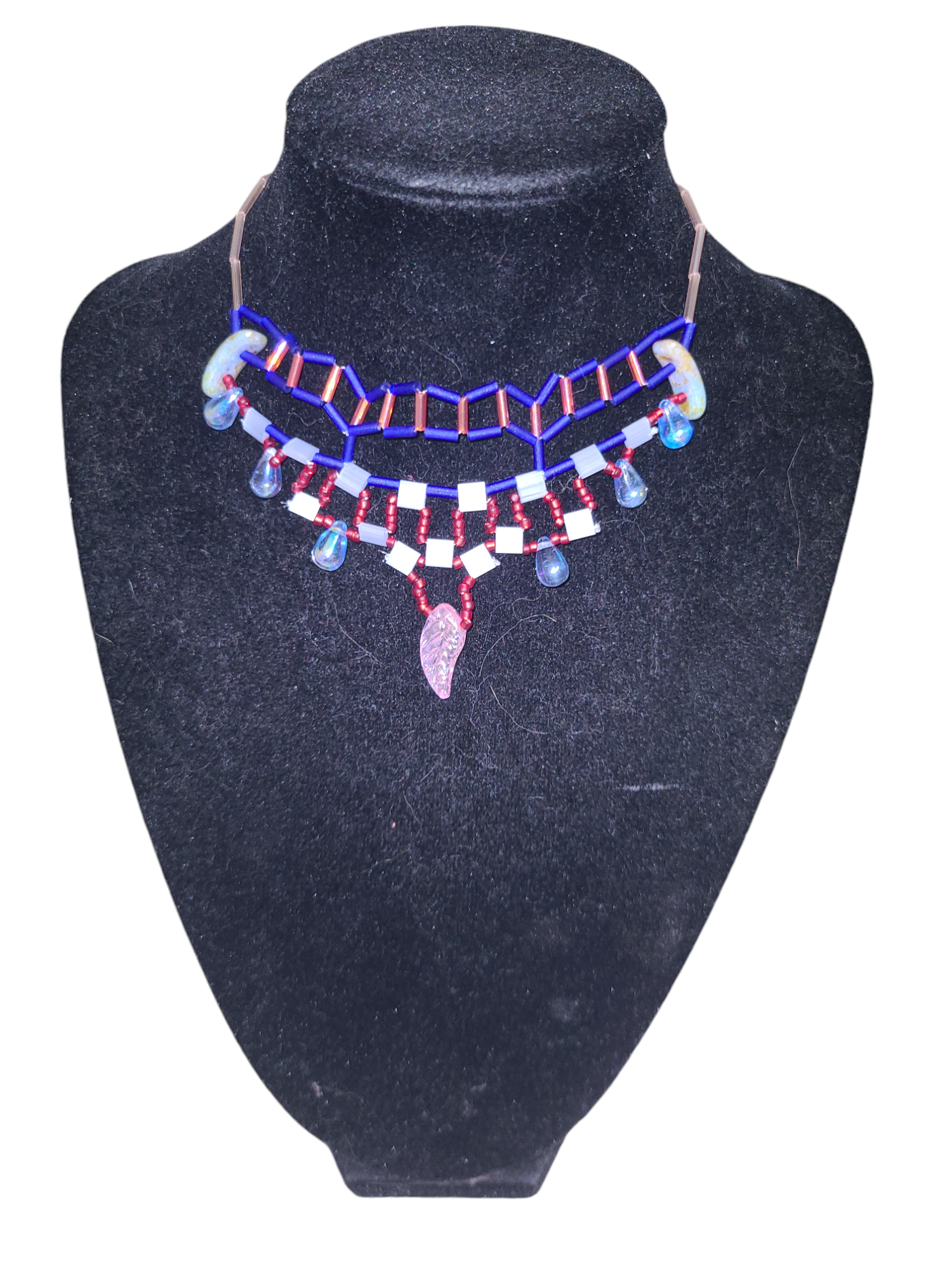This delicate statement necklace captures urban energy in a vibrant color palette. Its angular shapes and cool tones evoke the clean lines of cityscapes, while the pop of red provides a playful yet bold contrast. Perfect for adding a modern, artistic twist to your wardrobe.