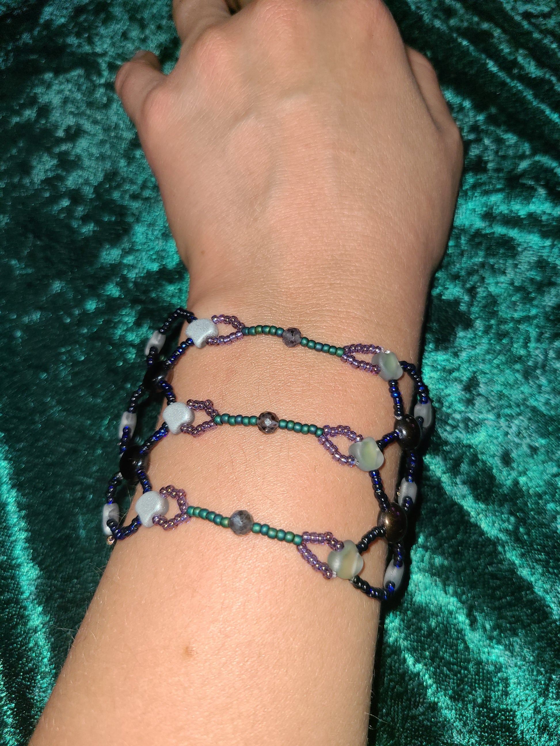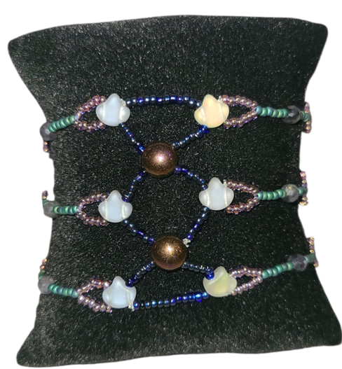A delicate mix of iolite stones, cobalt beads, opalescent circular accents, and warm bronze-toned beads, arranged in an open circular lattice pattern. The flexible fit makes it easy to wear solo or stacked. This bracelet works well with both pastel spring outfits and deeper jewel tones, making it a versatile year-round piece.