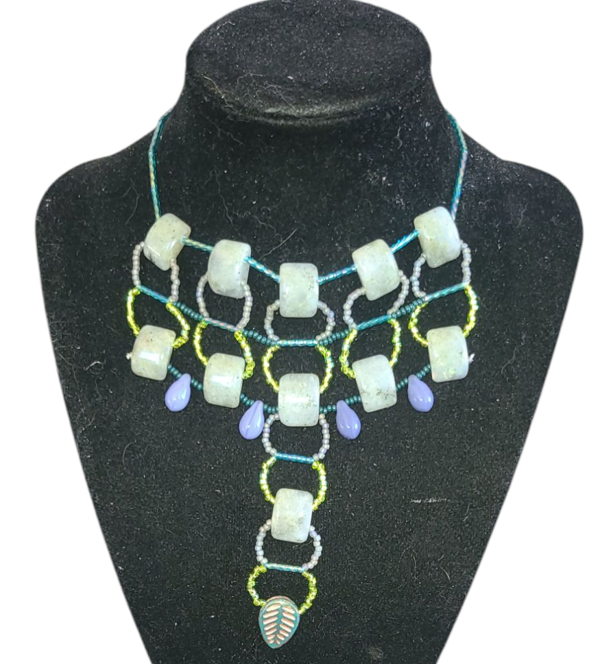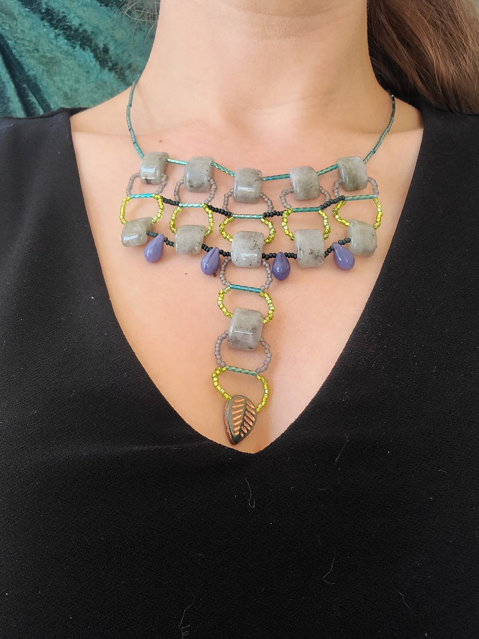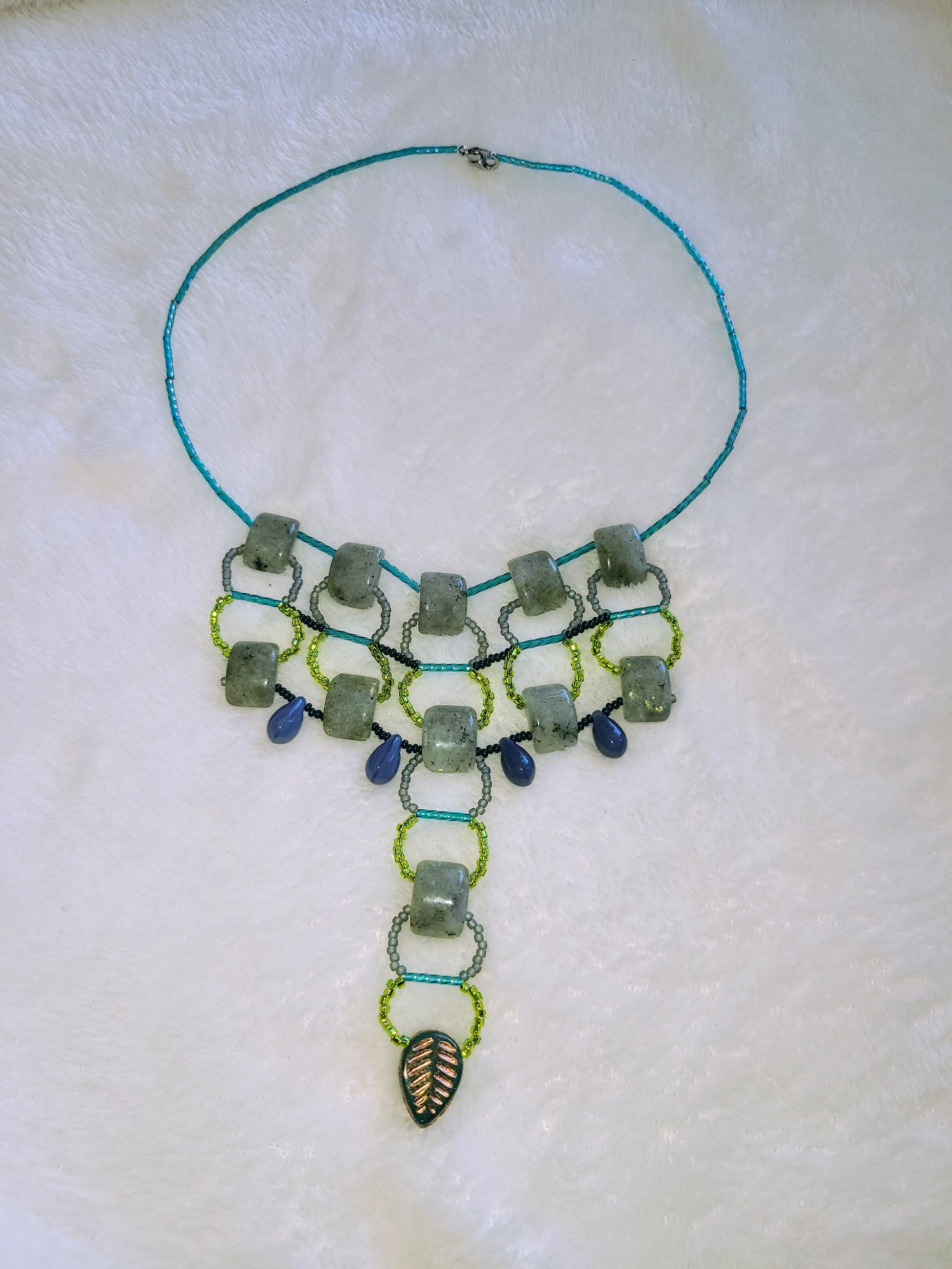 Inspired by Moroccan silverwork, this necklace pairs natural labradorite stones with a blue-green beaded frame. Four glass teardrop beads dangle at the bottom, centered by a delicate leaf bead at the center. Its bold shape feels surprisingly light and comfortable for all-day wear. Style it with a denim jacket and tee for a laid-back weekend, or layer it over a simple linen dress when you want a subtle artsy touch.